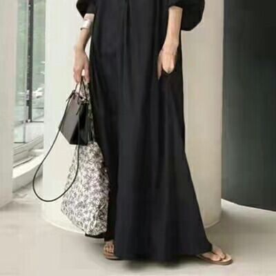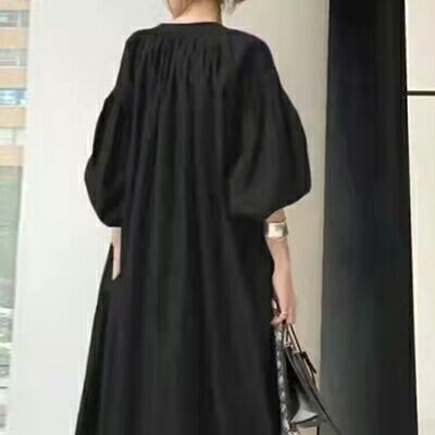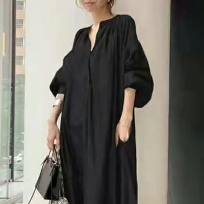 ボリューム袖 コーデワンピース カジュアル ロング丈 袖あり ランタンスリーブ おしゃれ レディース 可愛い マキシ丈 ワンピ ドレス 七分袖 Vネック クラシック ゆったり 体型カバー きれいめ ナチュラル リラックス ブラック 黒 夏 秋 20代 30代 40代 50代 コットン 綿