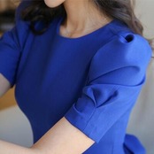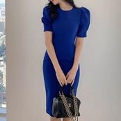 鮮やかなブルーカラーが目を引く上品なワンピース。