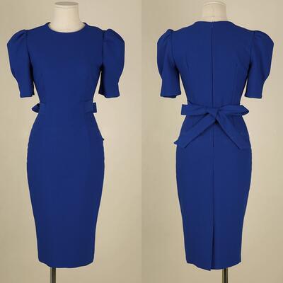 ワンピース きれいめ パーティー エレガント カジュアル 袖あり ミモレ丈 半袖 パフスリーブ おしゃれ レディース 可愛い フェミニン ワンピ ドレス ハイウエスト ウエストリボン お呼ばれ 大きいサイズ ブルー 青 春 秋 夏 20代 30代 40代 50代