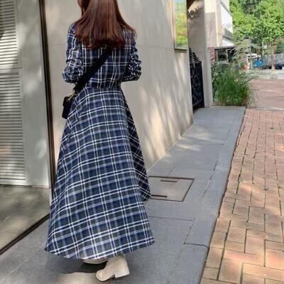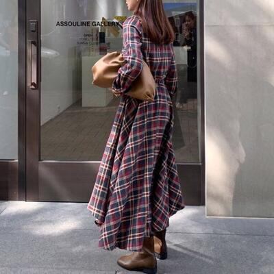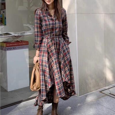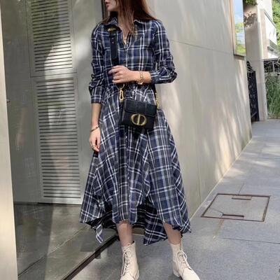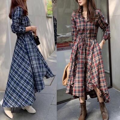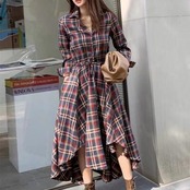 全2色 ワンピース チェック柄 カジュアル 袖あり ミモレ丈 シャツワンピ 長袖 アシンメトリー おしゃれ レディース 可愛い フェミニン ワンピ ドレス ハイウエスト ドロスト 大きいサイズ ブルー 青 レッド 赤 春 秋 冬 20代 30代 40代 50代