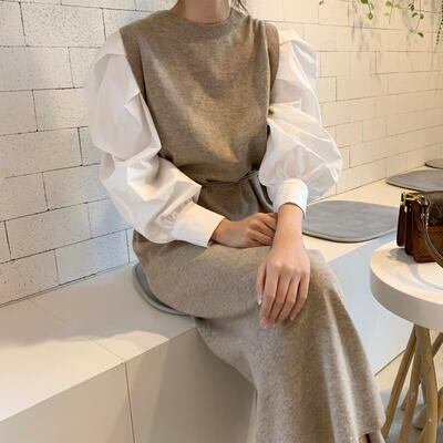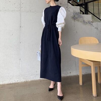 全2色 ワンピース パフスリーブ 袖あり 切り替え ニット きれいめ カジュアル ミモレ丈 おしゃれ レディース 可愛い フェミニン 長袖 シンプル ワンピ ドレス エレガント ウエストリボン 体型カバー ベージュ ブラック 春 秋 冬 20代 30代 40代 50代