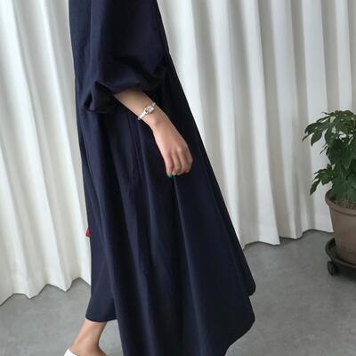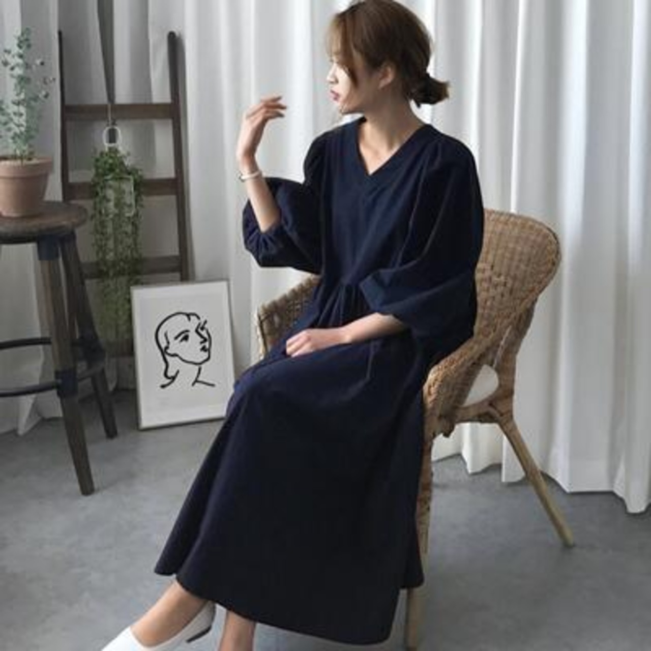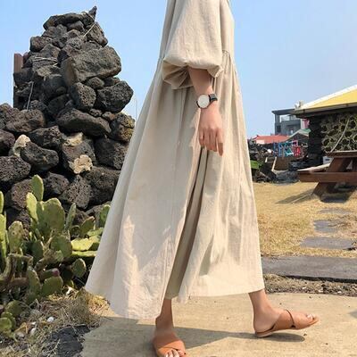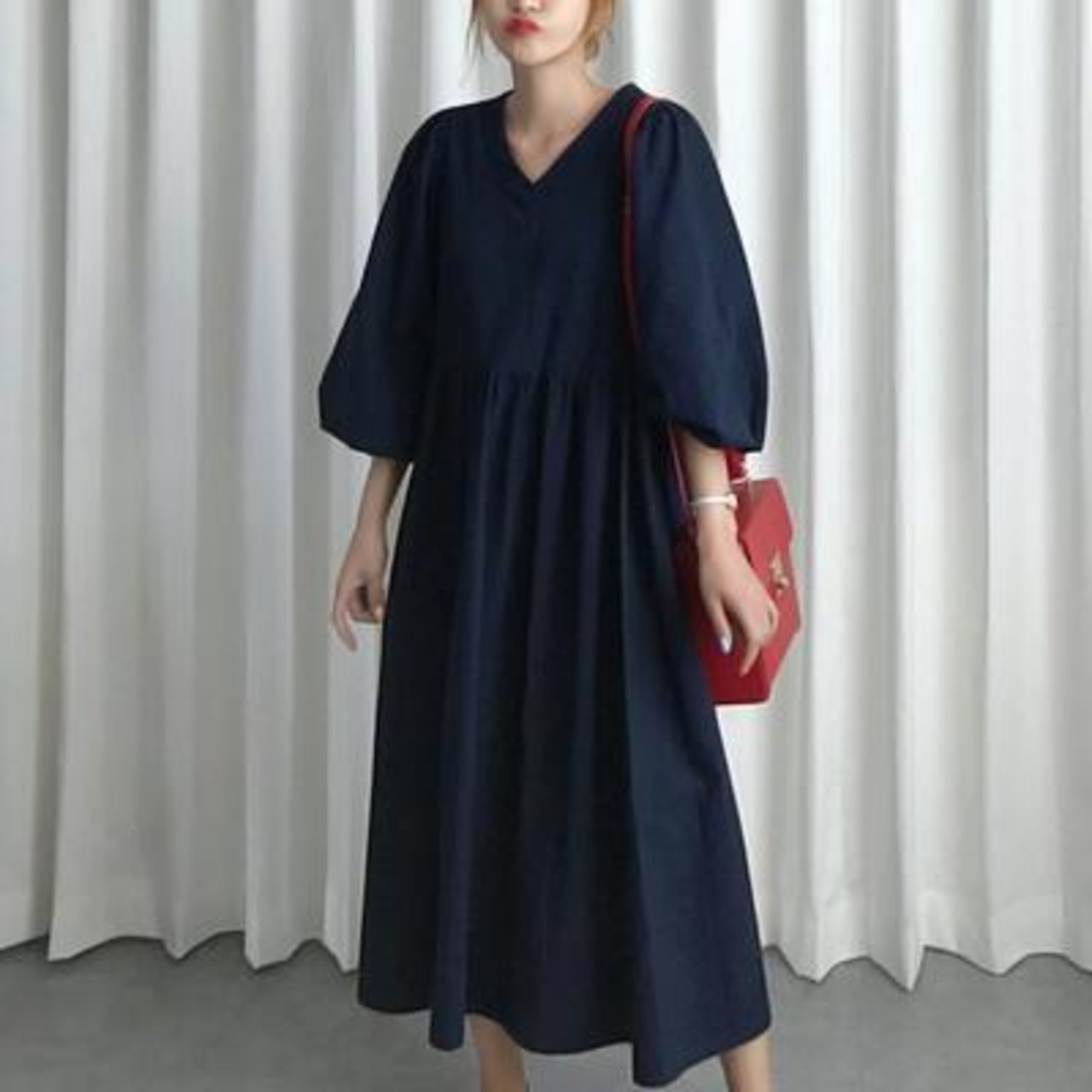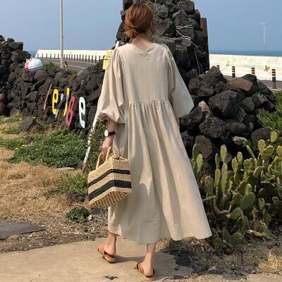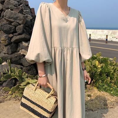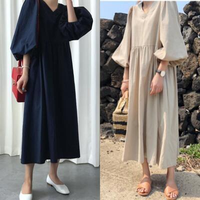 全2色 体型カバーリネン リネン混 ワンピース エレガント カジュアル 袖あり パフスリーブ ミモレ丈 綿麻 おしゃれ レディース 可愛い 七分袖 フェミニン ワンピ ドレス ナチュラル リラックス ゆったり ベージュ ブラック 黒 春 秋 夏 20代 30代 40代 50代
