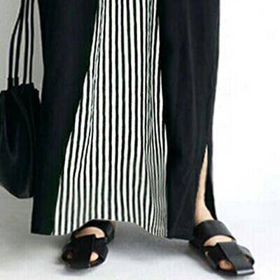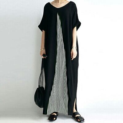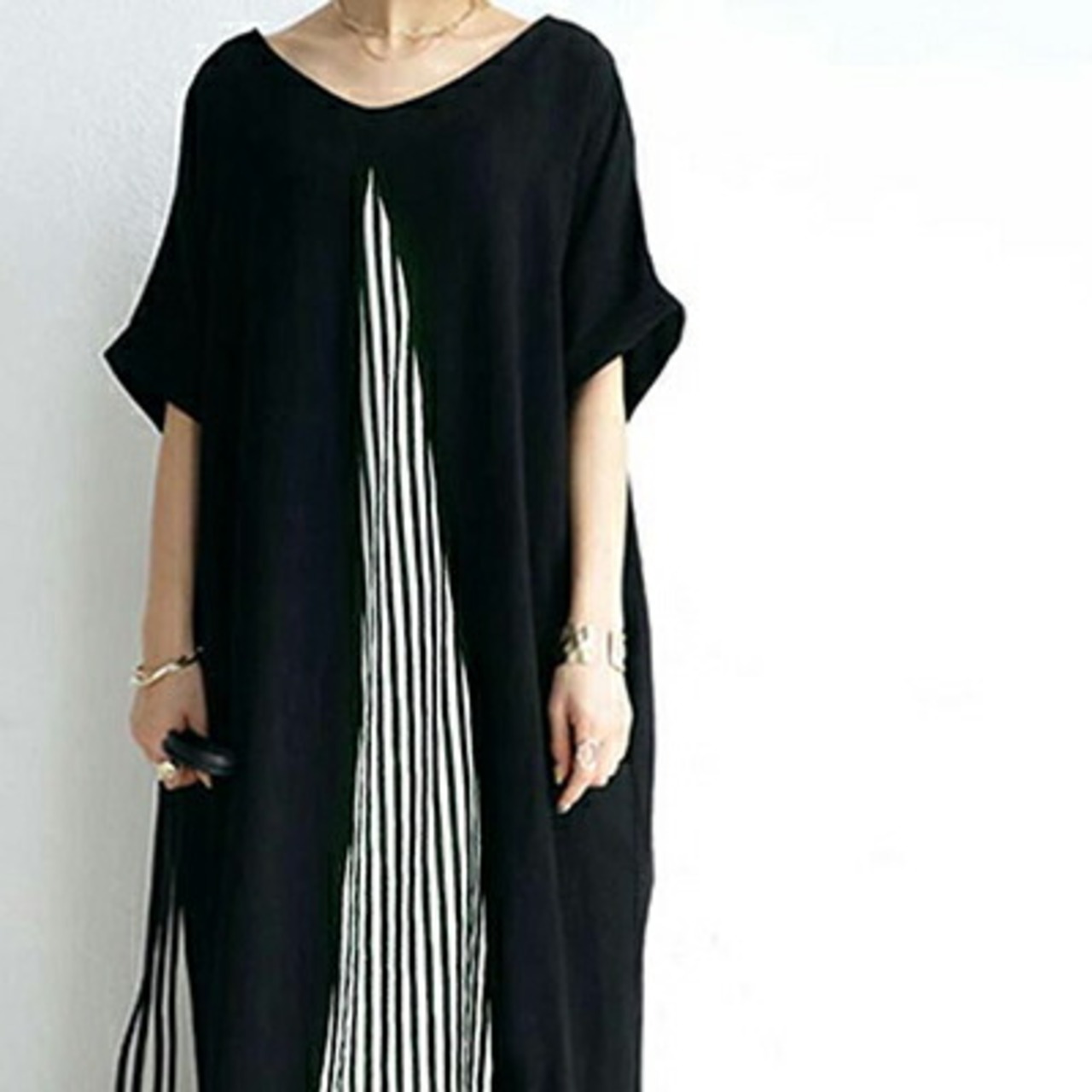 コーデ スリットワンピース カジュアル ロング丈 袖あり おしゃれ レディース 可愛い マキシ丈 ワンピ ドレス 半袖 ラウンドネック クラシック ゆったり 体型カバー きれいめ ストライプ リラックス ブラック 黒 夏 秋 20代 30代 40代 50代 コットン 綿 バイカラー