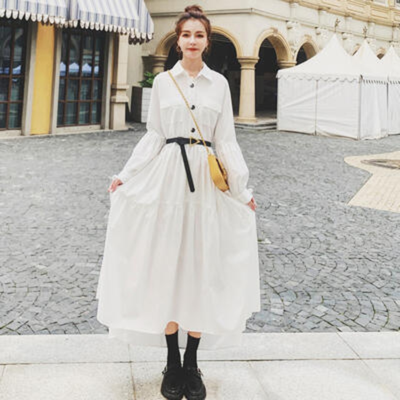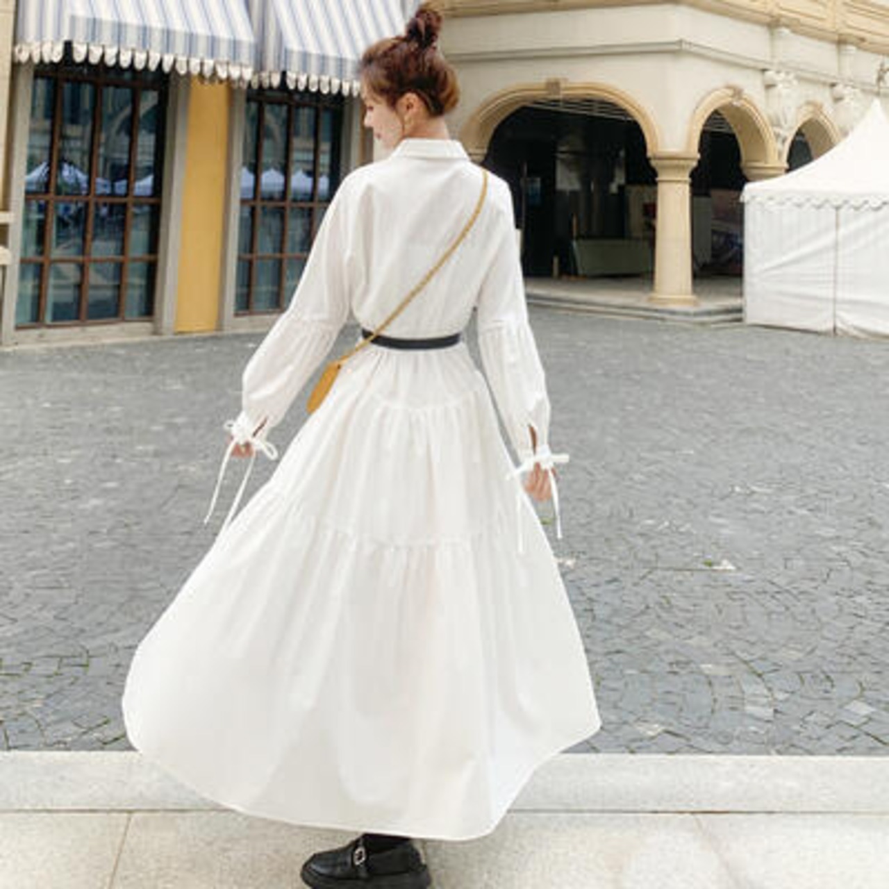 ティアード ワンピース エレガント 袖あり カジュアル ミモレ丈 シャツワンピ リボン おしゃれ レディース 可愛い フェミニン 長袖 ワンピ ドレス シンプル ハイウエスト ウエストベルト ホワイト 白 春 秋 冬 20代 30代 40代 50代