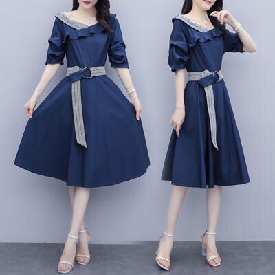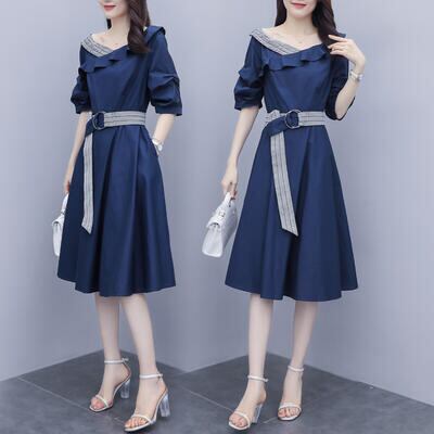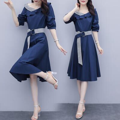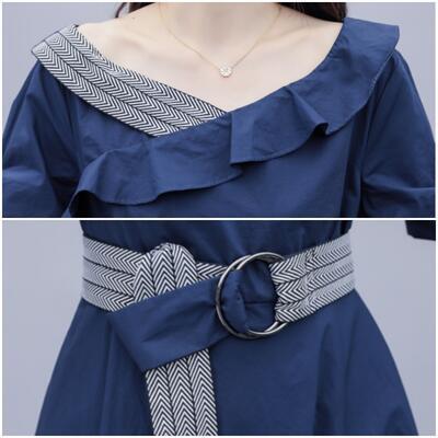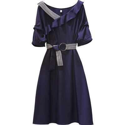 大きいサイズ ワンピース エレガント 袖あり カジュアル ひざ丈 フリル おしゃれ レディース 可愛い フェミニン 五分袖 ワンピ ドレス ウエストベルト ハイウエスト Aライン お呼ばれ ラッフル ブルー 青 春 秋 夏 20代 30代 40代 50代