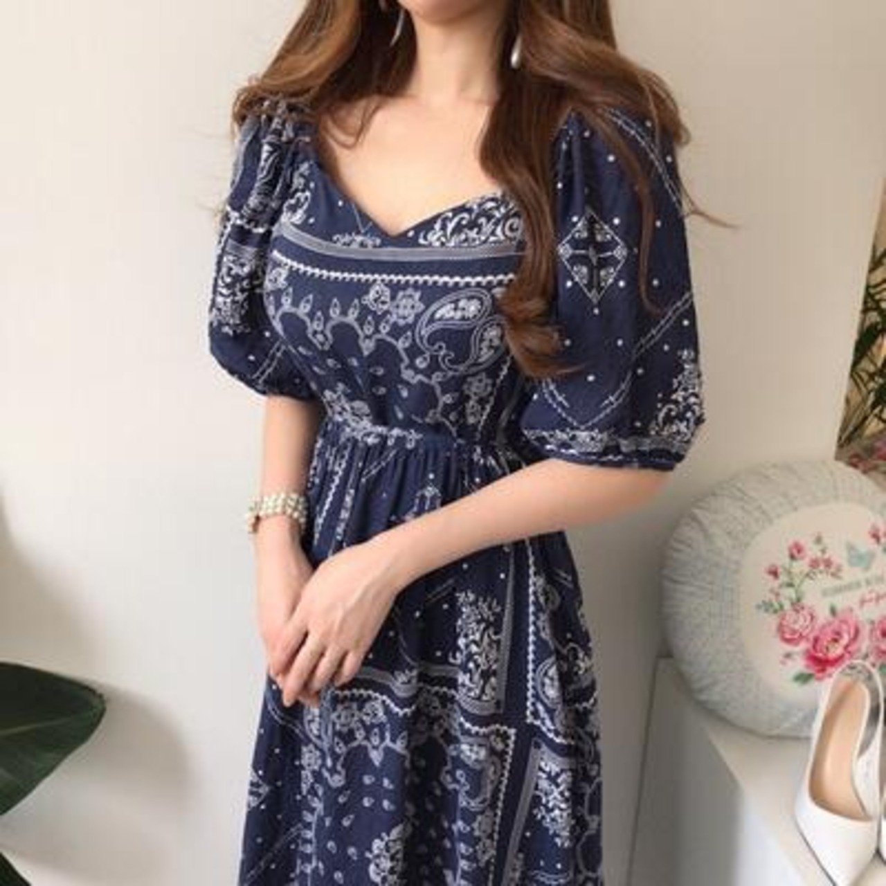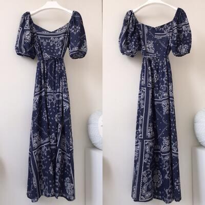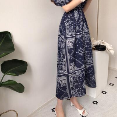 ワンピース エレガント 袖あり カジュアル ロング丈 バンダナ柄 おしゃれ レディース 可愛い ボリューム袖 フェミニン 半袖 パフスリーブ ワンピ ドレス ハイウエスト ロングワンピ Vネック ネイビー青 春 秋 夏 20代 30代 40代 50代