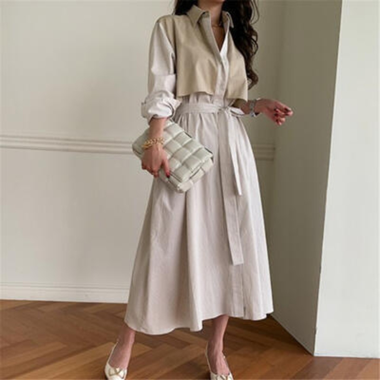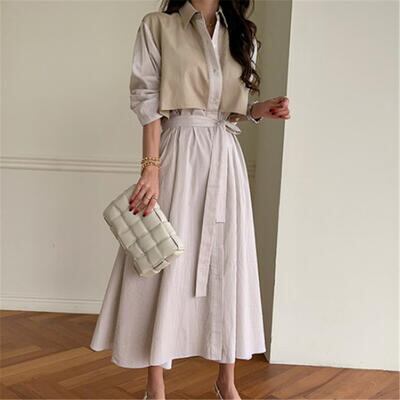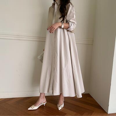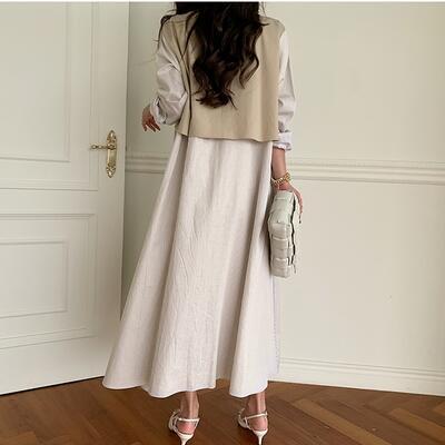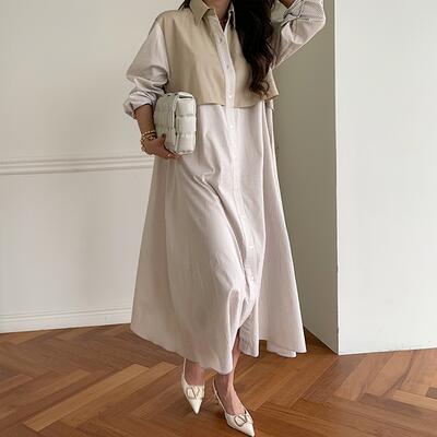 ゆったり 体型カバーワンピース エレガント 袖あり カジュアル ミモレ丈 ストライプ柄 おしゃれ レイヤード風 レディース 可愛い シャツワンピ フェミニン 長袖 ウエストリボン ワンピ ドレス 切り替え ハイウエスト ロングワンピ 春 秋 冬 20代 30代 40代 50代