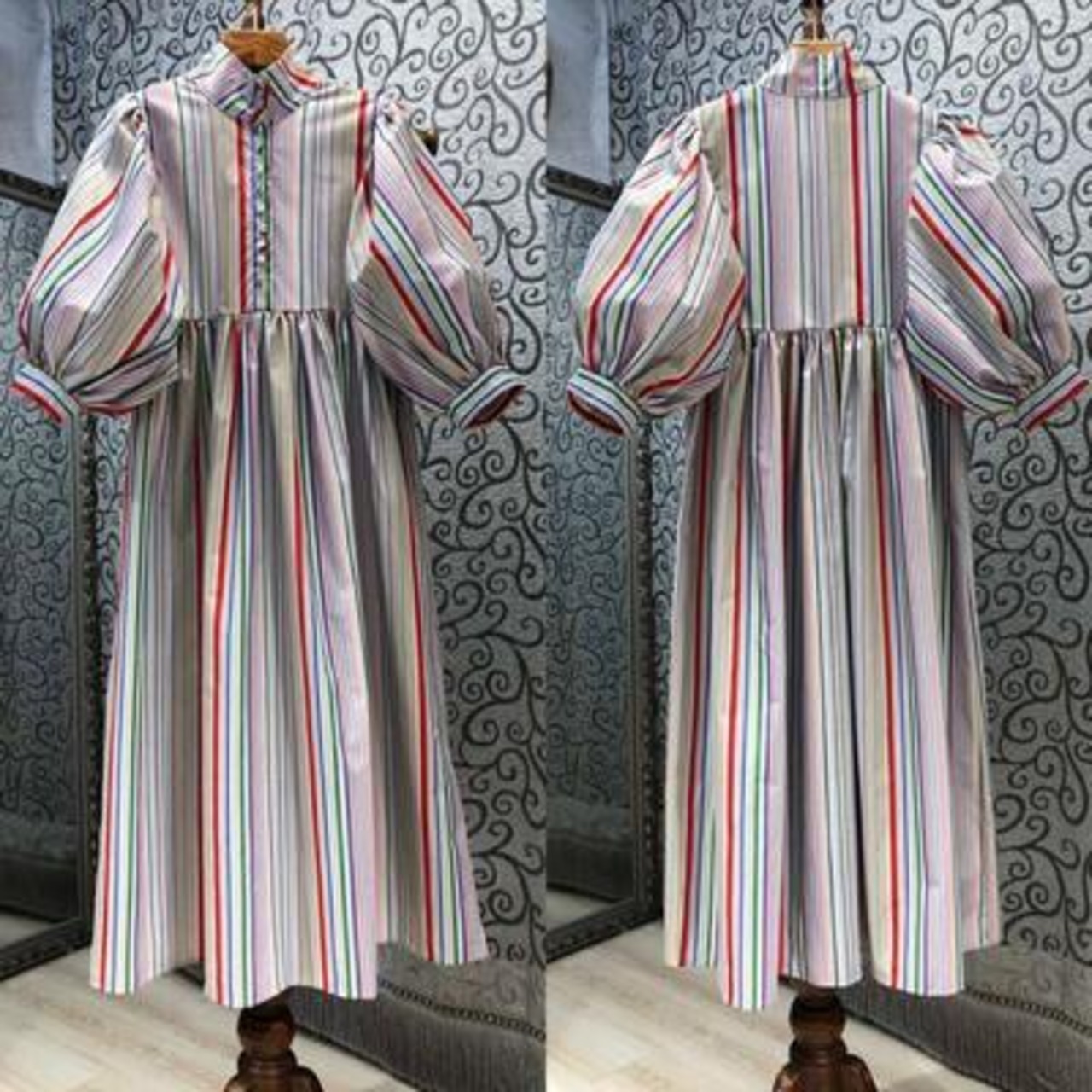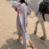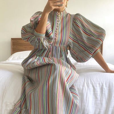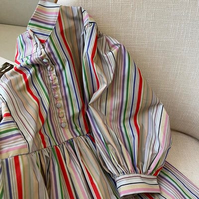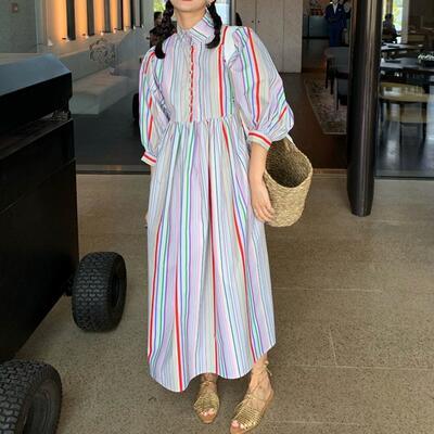 ワンピース パフスリーブ ストライプ 袖あり ハイネック きれいめ カジュアル ミモレ丈 レインボー おしゃれ レディース 可愛い フェミニン 五分袖 ワンピ ドレス ハイウエスト マルチカラー 春 秋 夏 20代 30代 40代 50代