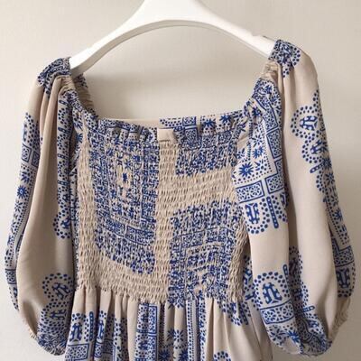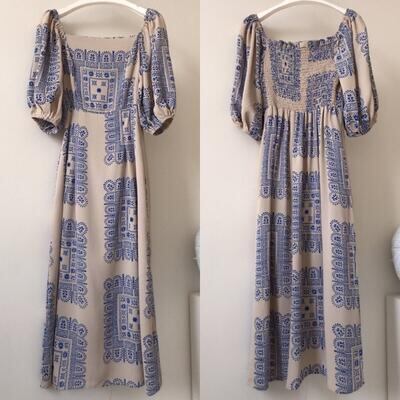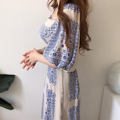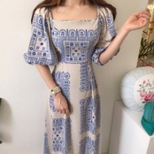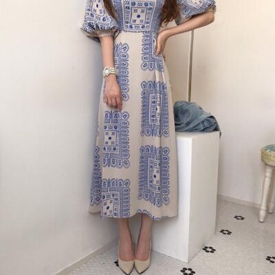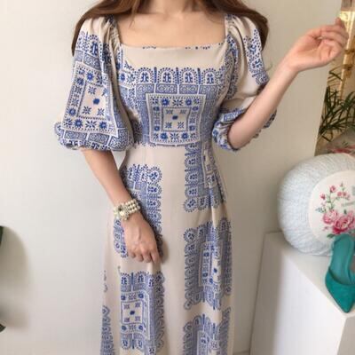 ワンピース パフスリーブ タイル柄 袖あり スクエアネック きれいめ カジュアル ロング丈 おしゃれ レディース 可愛い フェミニン 五分袖 ワンピ ドレス エレガント リゾート ハイウエスト レトロ ブルー 春 秋 夏 20代 30代 40代 50代