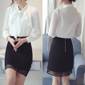 首元は女性らしさを引き立てるボウタイデザイン。