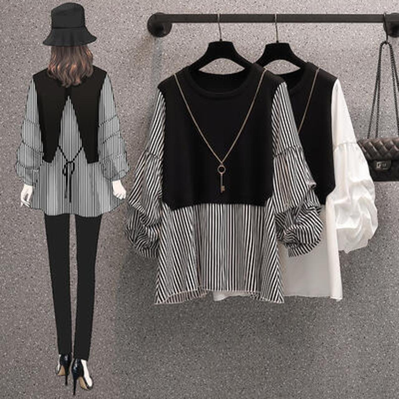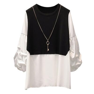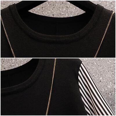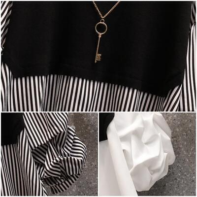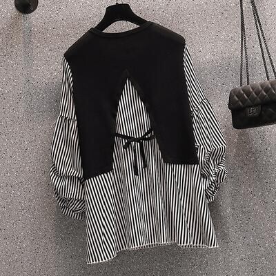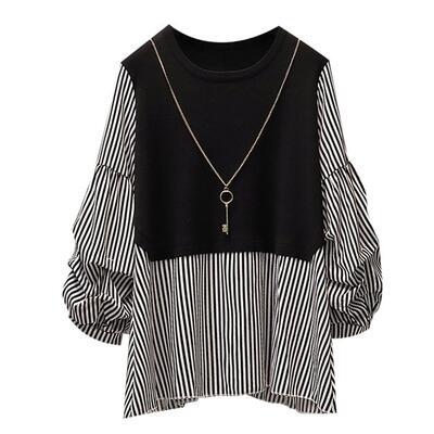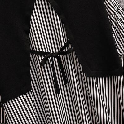 全2色 切り替えトップス レディース ブラウス レイヤード風 きれいめ カットソー カジュアル 長袖 おしゃれ 可愛い ストライプ柄 Tシャツ エレガント 大きいサイズ リボン フェミニン チュニック ホワイト 白 ブラック 黒 春 秋 冬 20代 30代 40代 50代