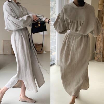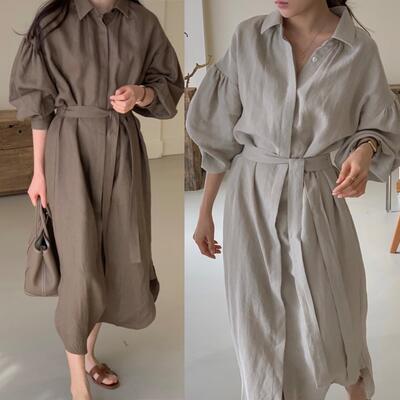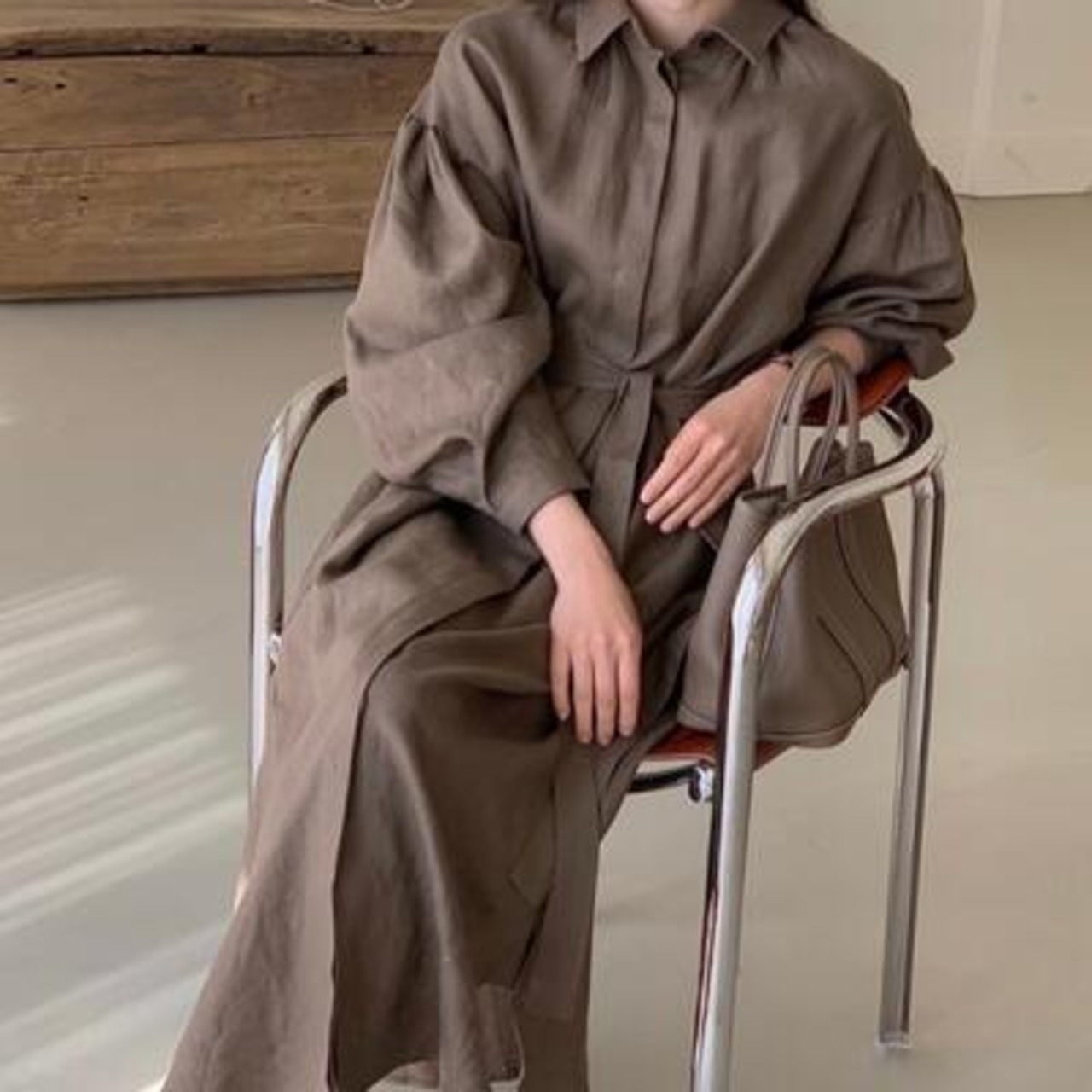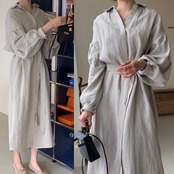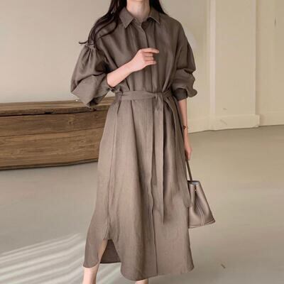 全2色 羽織 シンプルワンピース シャツワンピース 袖あり きれいめ カジュアル ロング丈 おしゃれ レディース 可愛い フェミニン 長袖 ウエストリボン ドロップショルダー ワンピ ドレス エレガント ハイウエスト グレー ブラウン 春 秋 20代 30代 40代 50代