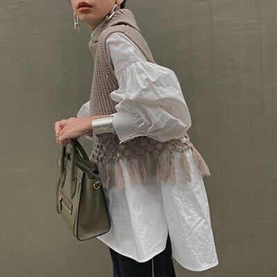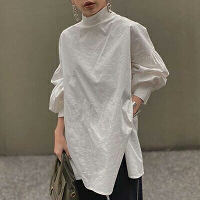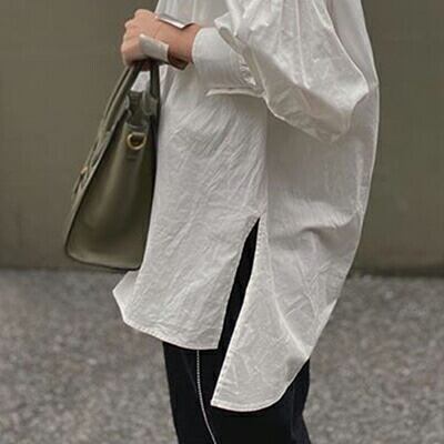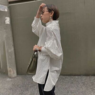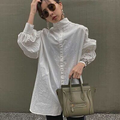 トップス レディース ブラウス シャツ ボリューム袖 きれいめ カジュアル 長袖 カットソー 2Way おしゃれ クラシック フェミニン 春 夏 秋 ゆったり 体型カバー ホワイト シンプル フリーサイズ スタンドカラー モード リラックス コットン綿 20代 30代 40代 50代