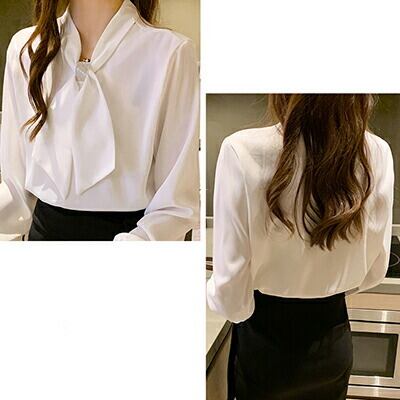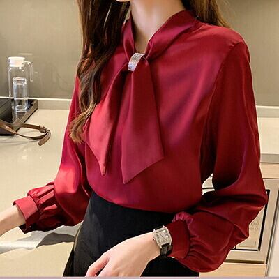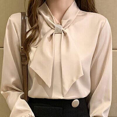 全3色 韓国 コーデ 通勤服 オフィス ビジネス お呼ばれ トップス レディース ブラウス 春 秋 シャツ 袖あり カジュアル ブラウス 長袖 白 ホワイト レッド 赤 アプリコット 光沢 大きいサイズ 2XL シンプル ボウタイ リボン サテンデート きれいめ おしゃれ 20代 30代 40代 50代