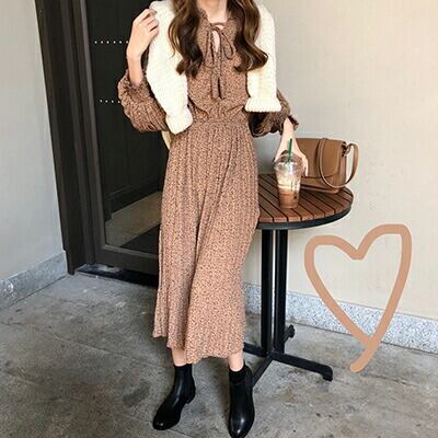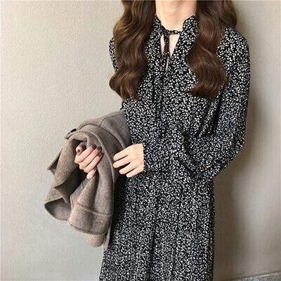 全2色 ゆったり 花柄 ロング丈 ワンピースロングワンピース レディース かわいい カジュアル 袖あり Aライン 長袖 ワンピ おしゃれ 韓国 コーデ ガーリー ブラック 黒 アプリコット 春 秋 お出かけ デート 10代 20代 30代 40代 50代