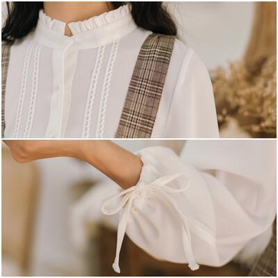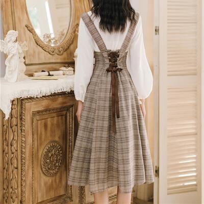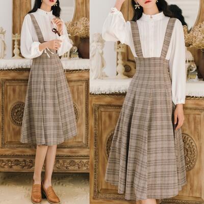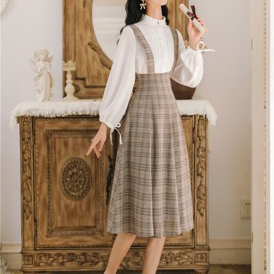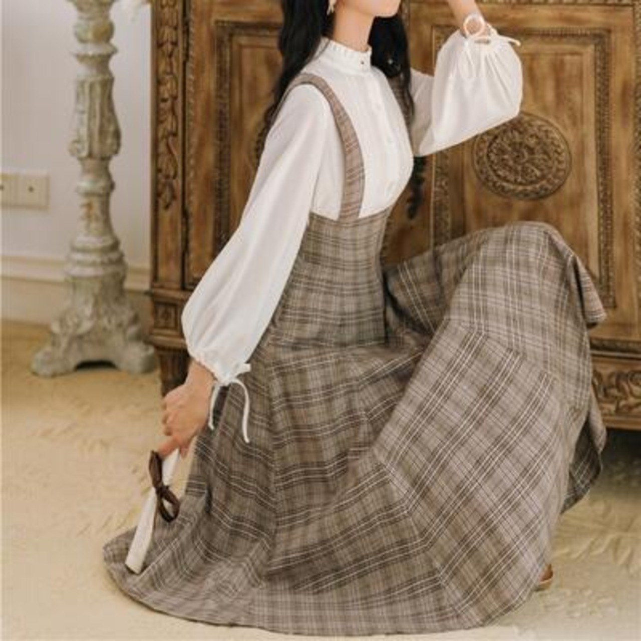 セットアップ 2点セット トップス サロペットスカート ブラウス レディース 長袖 カジュアル ジャンパースカート チェック 可愛い クラシカル スタンドカラー パフスリーブ ハイウエスト ひざ丈 ホワイト 白 ブラウン 春 秋 冬 20代 30代 40代 50代