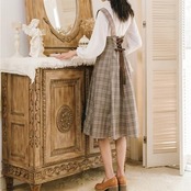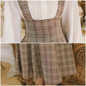 スタンドカラーのブラウスとチェック柄のジャンパースカート。