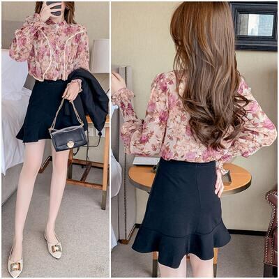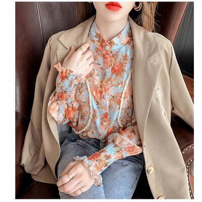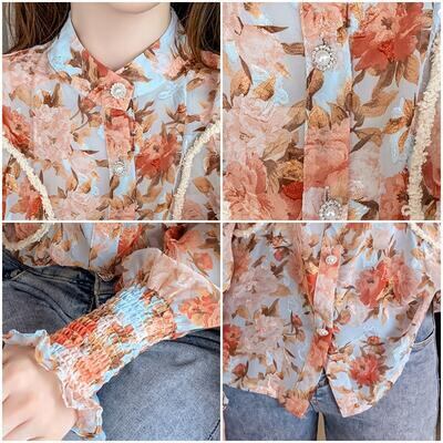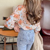 柔らかなシフォン素材の花柄ブラウス。