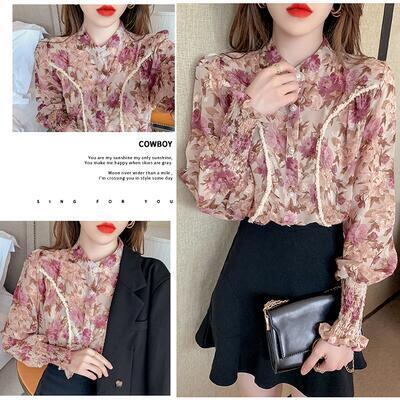 全2色 トップス レディース ブラウス シャツ 花柄 きれいめ カジュアル 長袖 クラシカル おしゃれ 可愛い フェミニン パフスリーブ バンドカラー 透け感 ナチュラル ヴィンテージ エレガント こなれ感 パープル オレンジ 秋 春 冬 20代 30代 40代 50代