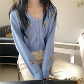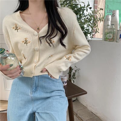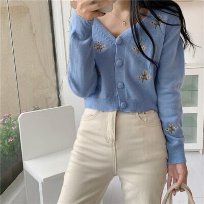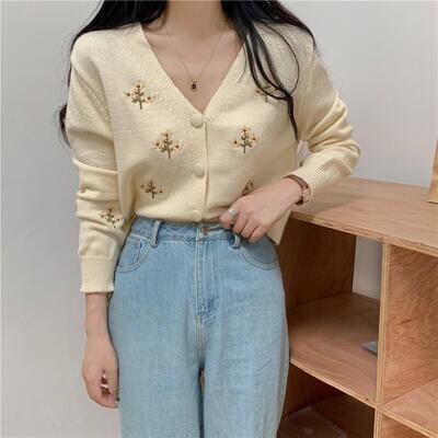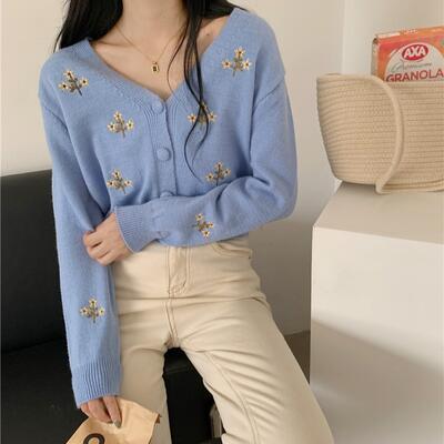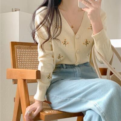全2色 トップス レディース カーディガン ニット 花柄 きれいめ カジュアル 長袖 羽織 刺繍 おしゃれ 可愛い フェミニン Vネック ショート丈 体型カバー スタイルアップ ナチュラル ヴィンテージ ブルー 青 ベージュ 秋 春 冬 20代 30代 40代 50代
