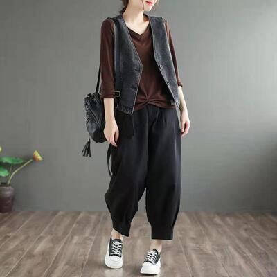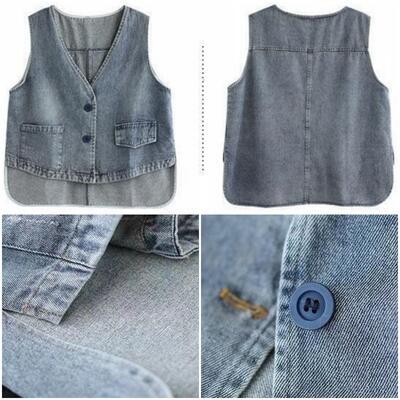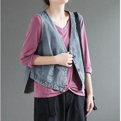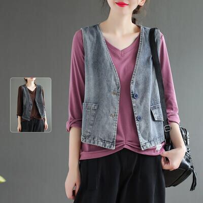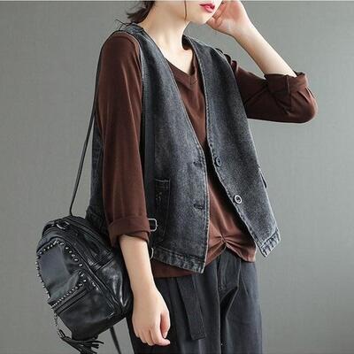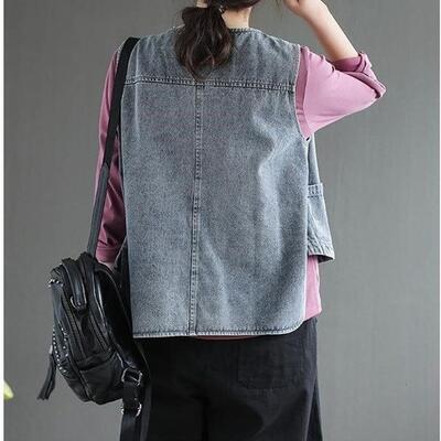 全2色 ビンテージトップス レディース ベスト ジャケット ノースリーブ ジレ デニム カジュアル 羽織 おしゃれ マニッシュ かっこいい Vネック 体型カバー シンプル 大きいサイズ ブラック 黒 ブルー オールシーズン 夏 秋 春 冬 20代 30代 40代 50代
