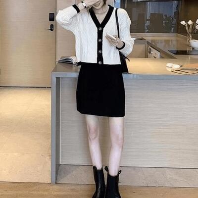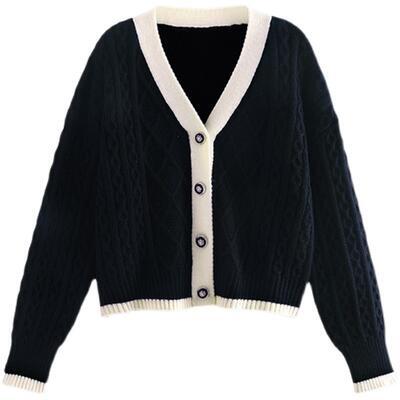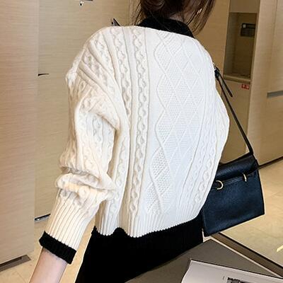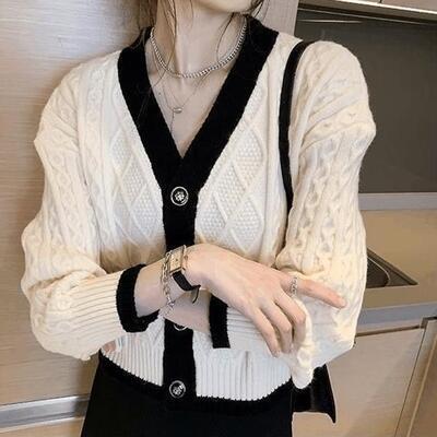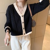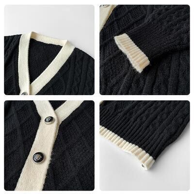 全2色 大きいサイズトップス レディース カーディガン ニット セーター バイカラー きれいめ カジュアル 長袖 羽織 アウター おしゃれ 可愛い フェミニン ケーブル編み Vネック 体型カバー ホワイト 白 ブラック 黒 秋 春 冬 20代 30代 40代 50代