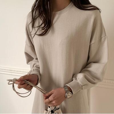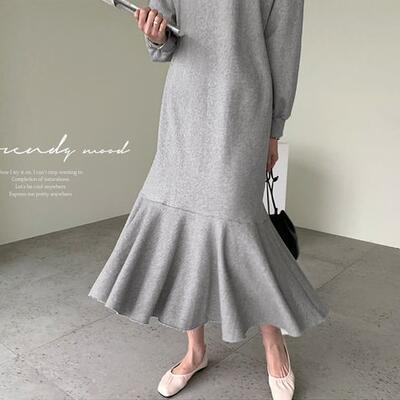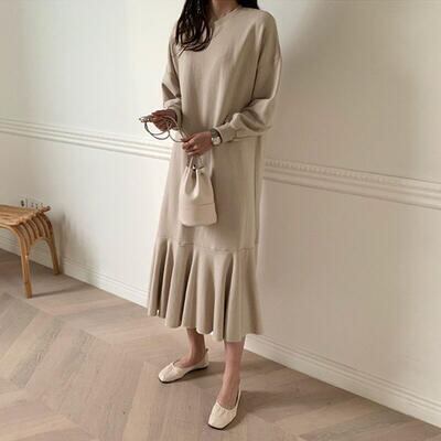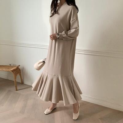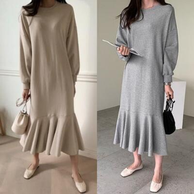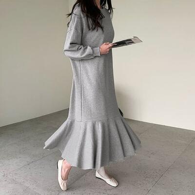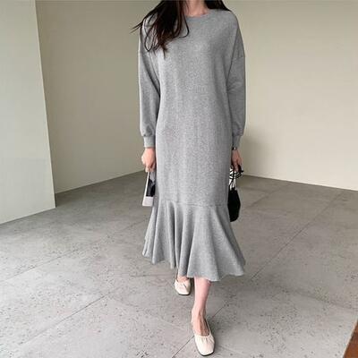 全2色 ナチュラル マーメイドワンピース レディース 袖あり 長袖 フリル カジュアル ロング丈 ゆったり おしゃれ こなれ感 可愛い フェミニン シンプル ワンピ ドレス 体型カバー Tシャツワンピ ドロップショルダー ベージュ グレー 春 秋 冬 20代 30代 40代 50代
