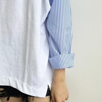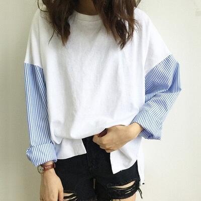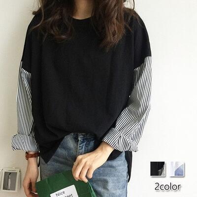 全2色 大きいサイズトップス レディース Tシャツ 切り替え カジュアル 長袖 おしゃれ 可愛い ストライプ柄 かっこいい ゆったり ビッグシルエット オーバーサイズ ボーイッシュ 体型カバー ブラック 黒 ホワイト 白 秋 春 冬20代 30代 40代 50代