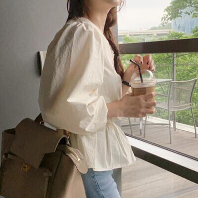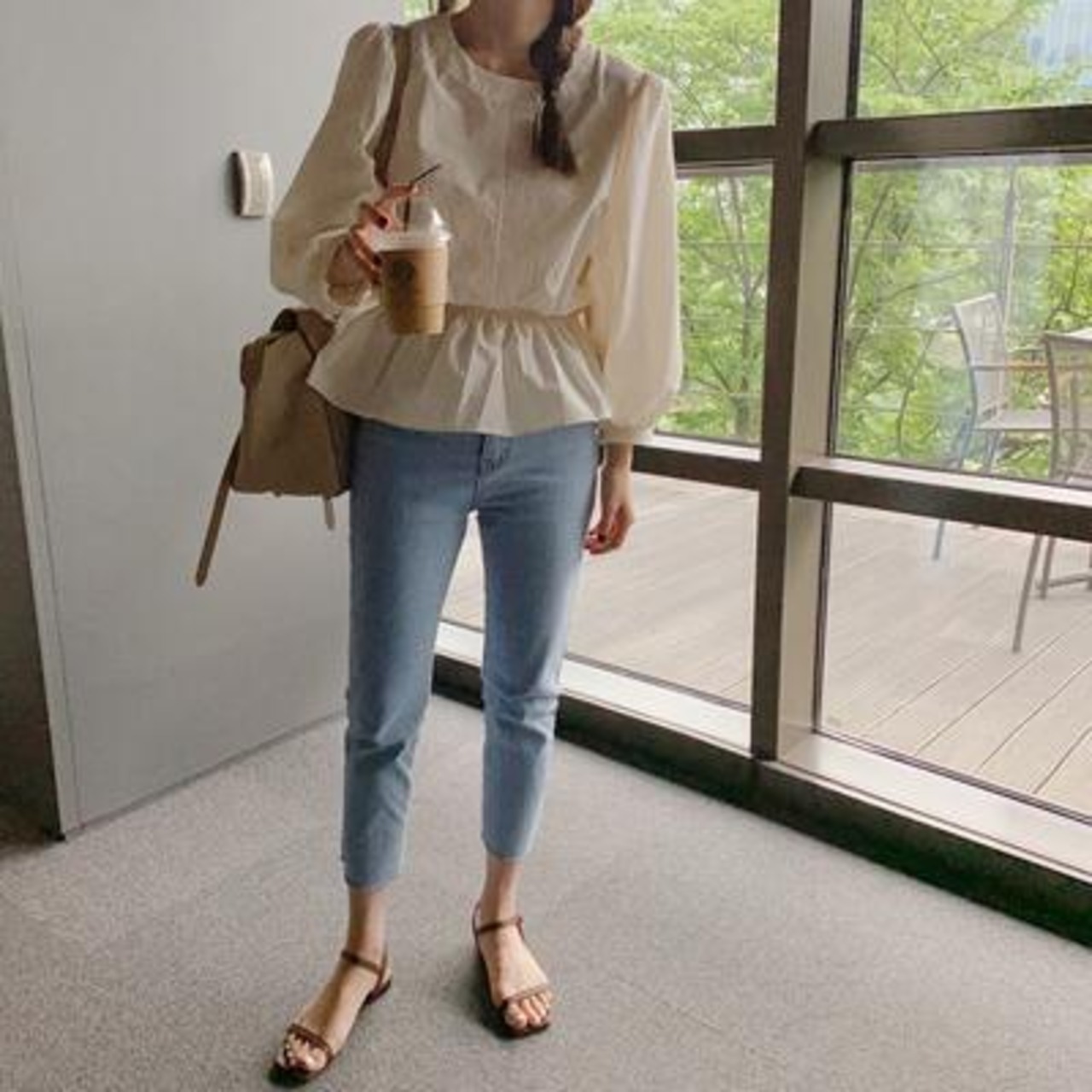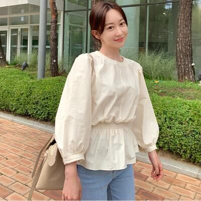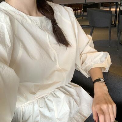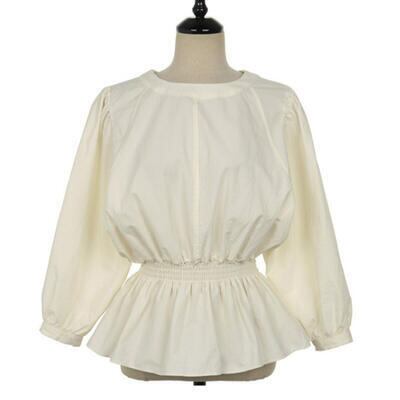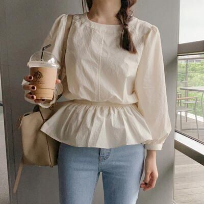 トップス レディース Tシャツ ブラウス ペプラム カジュアル きれいめ フリル 長袖 おしゃれ 可愛い パフスリーブ かっこいい ナチュラル フェミニン こなれ感 体型カバー お腹カバー シャツ ベージュ 秋 春 冬 20代 30代 40代 50代