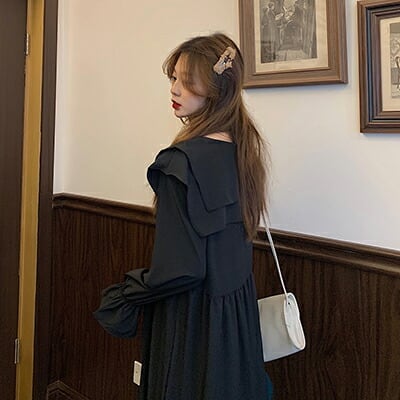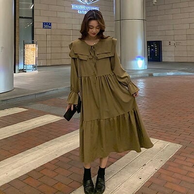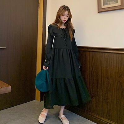 全2色 ロングワンピース レディース おしゃれ かわいい ロング丈 ひざ下 キャメル ブラック 黒 Aライン ドレス ガーリー ミモレ丈 大きいサイズ 袖あり ゆったり 長袖 春 秋 冬 韓国 コーデ デート お出かけ 20代 30代 40代 50代