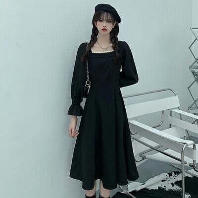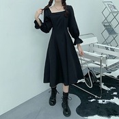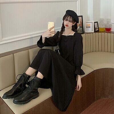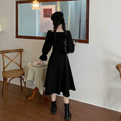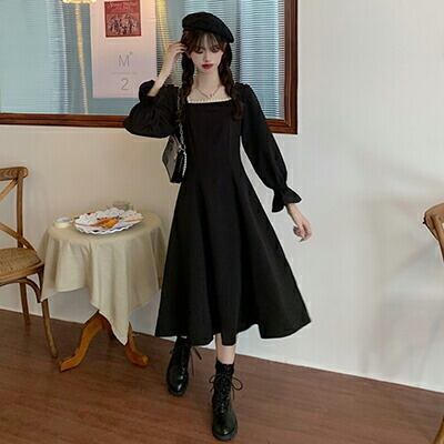 ワンピース 袖あり 長袖 フレンチ クラシカル カジュアル ミモレ丈 ゆったり ひざ丈 おしゃれ 清楚 可愛い フェミニン シンプル ワンピ ドレス 体型カバー ブラック 黒コーデ 通勤 オフィス 春 秋 冬 20代 30代 40代 50代 大きいサイズXL 2XL 3XL 4XL