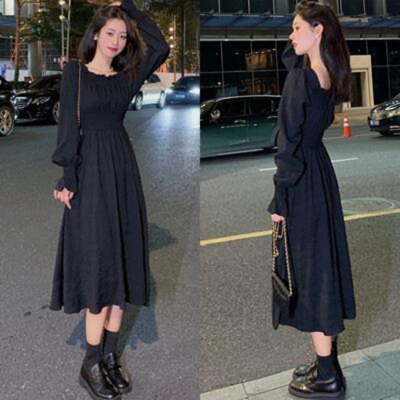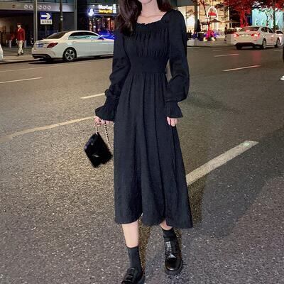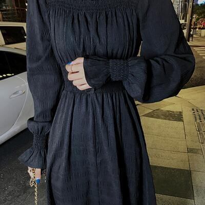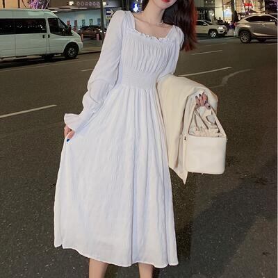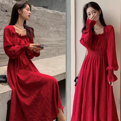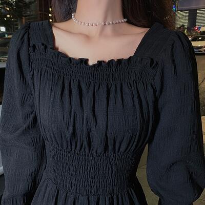 全3色 ワンピース レディース 袖あり 長袖 スクエアネック エレガント カジュアル ミモレ丈 おしゃれ こなれ感 可愛い フェミニン シンプル ワンピ ドレス Aライン パフスリーブ ホワイト 白 ブラック 黒 レッド 春 秋 冬 20代 30代 40代 50代