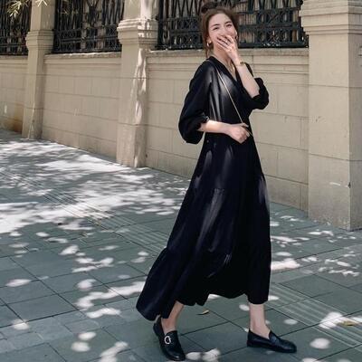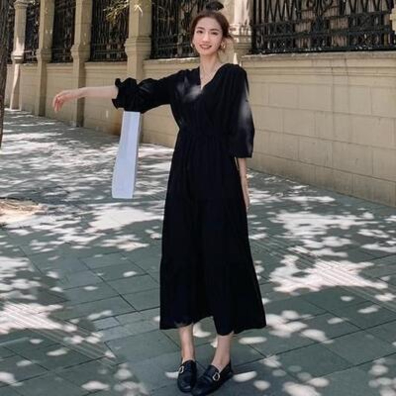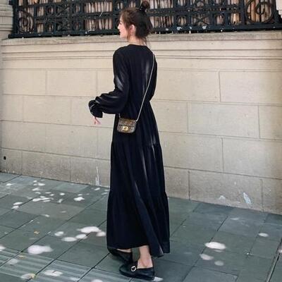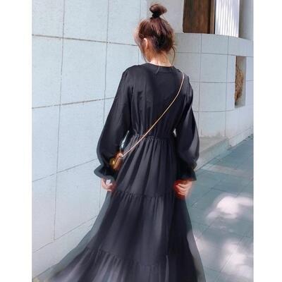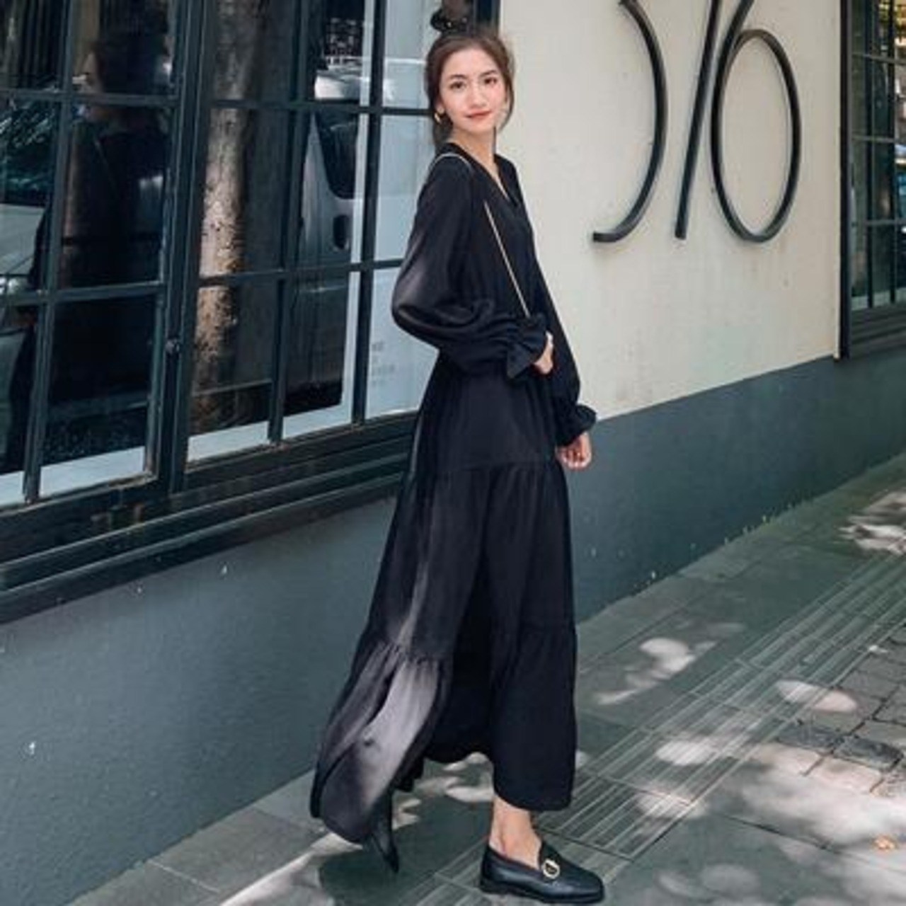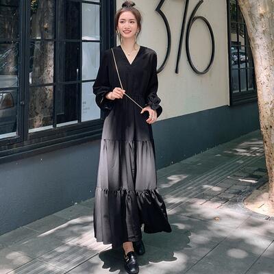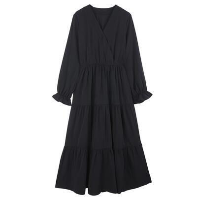 ティアード ワンピース レディース 袖あり 長袖 フリル エレガント カジュアル ロング丈 おしゃれ こなれ感 可愛い フェミニン シンプル カシュクール ワンピ ドレス Aライン ブラック 黒 春 秋 冬 20代 30代 40代 50代