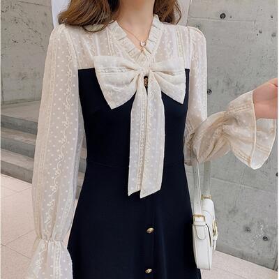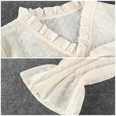 透け感のある首周りと袖は、ドットやフリルをあしらい女性らしいデザインに。
