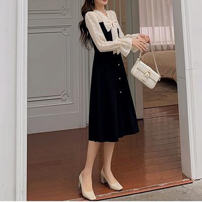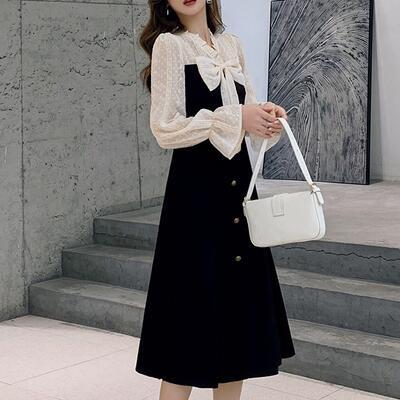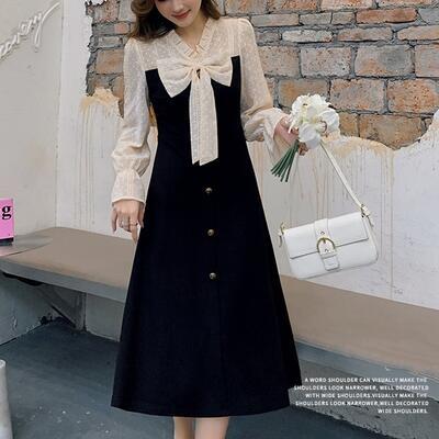 大きいサイズワンピース レディース 袖あり 長袖 フリル エレガント リボン ミモレ丈 おしゃれ 可愛い フェミニン レース 透け感 ワンピ ドレス ドット ハイウエスト カジュアル きれいめ ブラック 黒 春 秋 冬 20代 30代 40代 50代