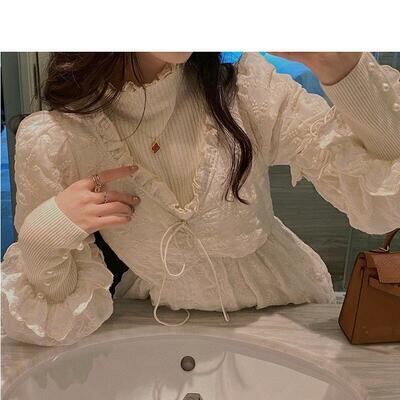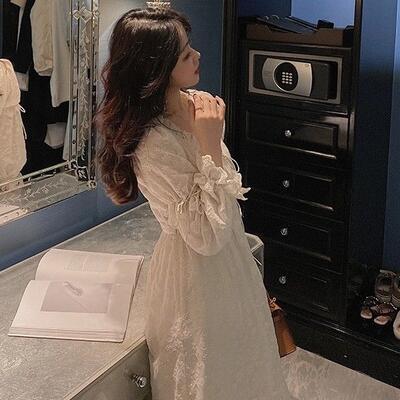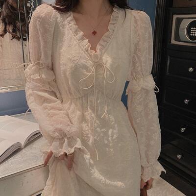 ワンピース レディース レース パフスリーブ 袖あり 長袖 きれいめ フリル ミモレ丈 おしゃれ 可愛い フェミニン カジュアル ワンピ ドレス Aライン ハイウエスト 透け感 リボン ガーリー エレガント ベージュ 春 秋 冬 20代 30代 40代 50代