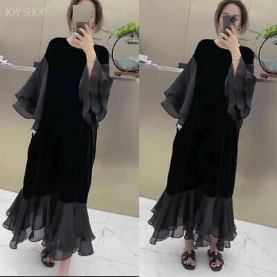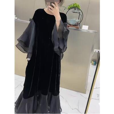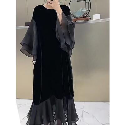 ワンピース レディース ベルベット フレアスリーブ 袖あり 長袖 きれいめ フリル ロング丈 おしゃれ 可愛い フェミニン カジュアル ワンピ ドレス Aライン ゆったり エレガント 体型カバー ブラック 黒 春 秋 冬 20代 30代 40代 50代