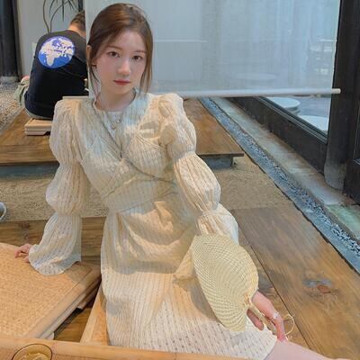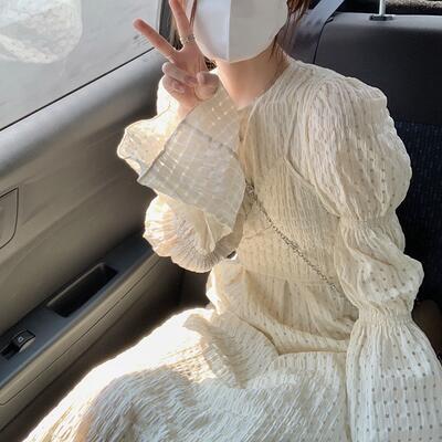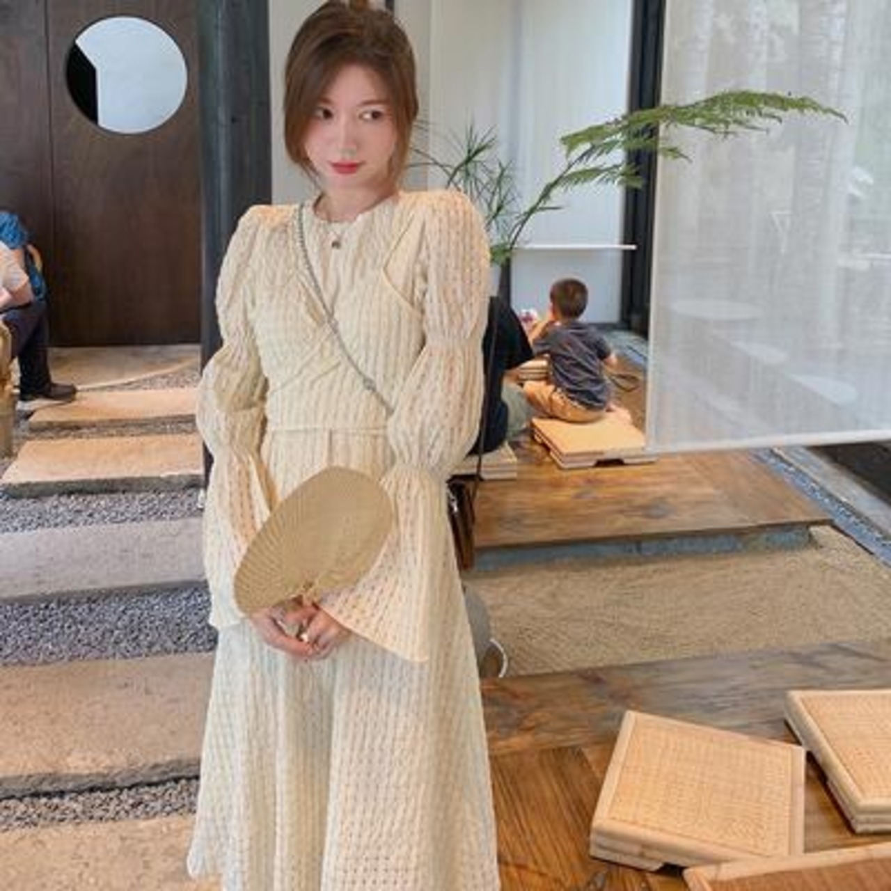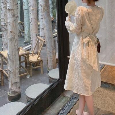 ワンピース レディース 袖あり きれいめ 長袖 パフスリーブ エレガント ウエストリボン ミモレ丈 ひざ丈 おしゃれ 可愛い フェミニン Aライン ワンピ ドレス ハイウエスト カジュアル ナチュラル ベージュ 春 秋 冬 20代 30代 40代 50代