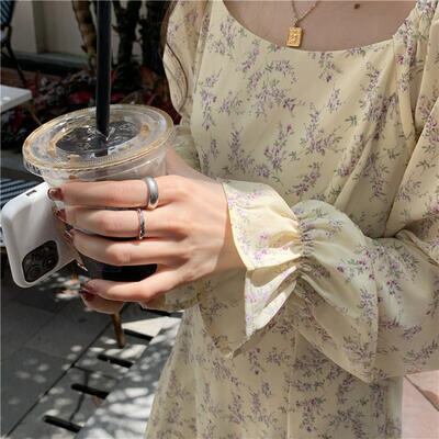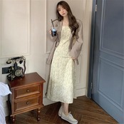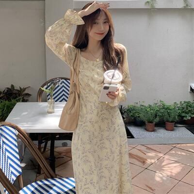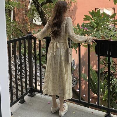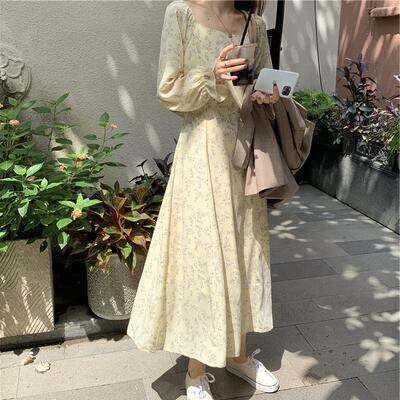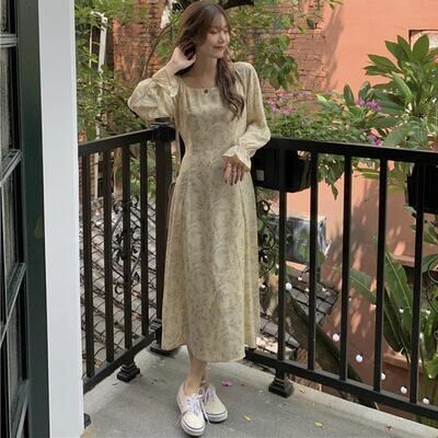 ワンピース レディース 袖あり きれいめ 長袖 パフスリーブ 花柄 エレガント ウエストリボン ミモレ丈 ロング丈 おしゃれ 可愛い フェミニン Aライン ワンピ ドレス ハイウエスト カジュアル ナチュラル ベージュ 春 秋 冬 20代 30代 40代 50代