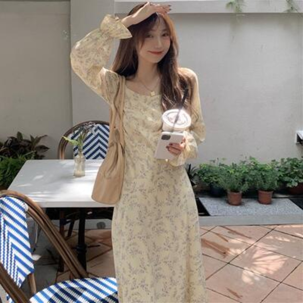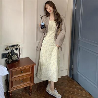 淡いカラーが優しげな印象の花柄ワンピース。