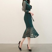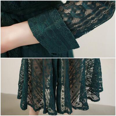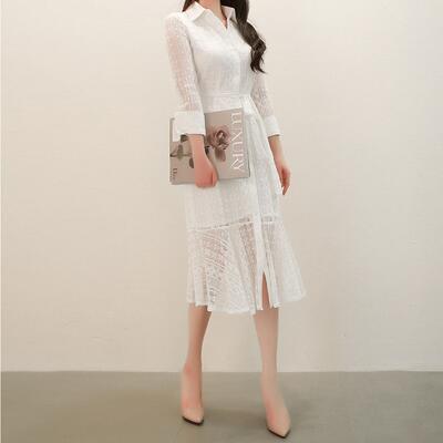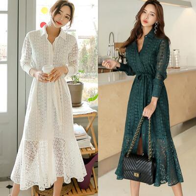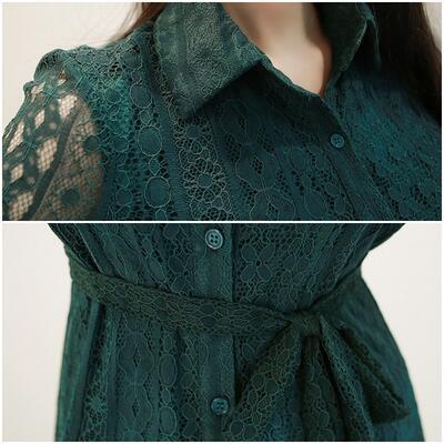 全2色 大きいサイズワンピース レディース 袖あり 長袖 レース きれいめ シャツワンピース ミモレ丈 おしゃれ 可愛い フェミニン カジュアル ワンピ ドレス エレガント ウエストリボン ハイウエスト グリーン ホワイト 白 春 秋 冬 20代 30代 40代 50代