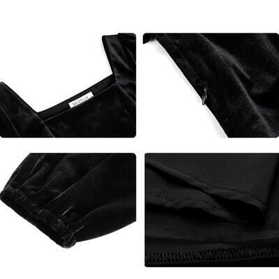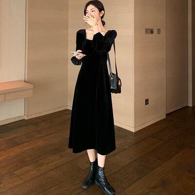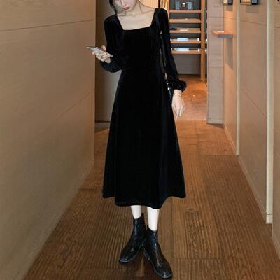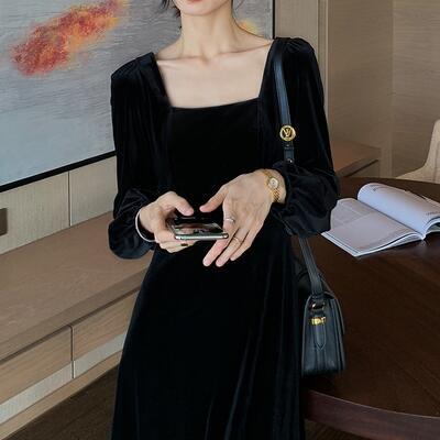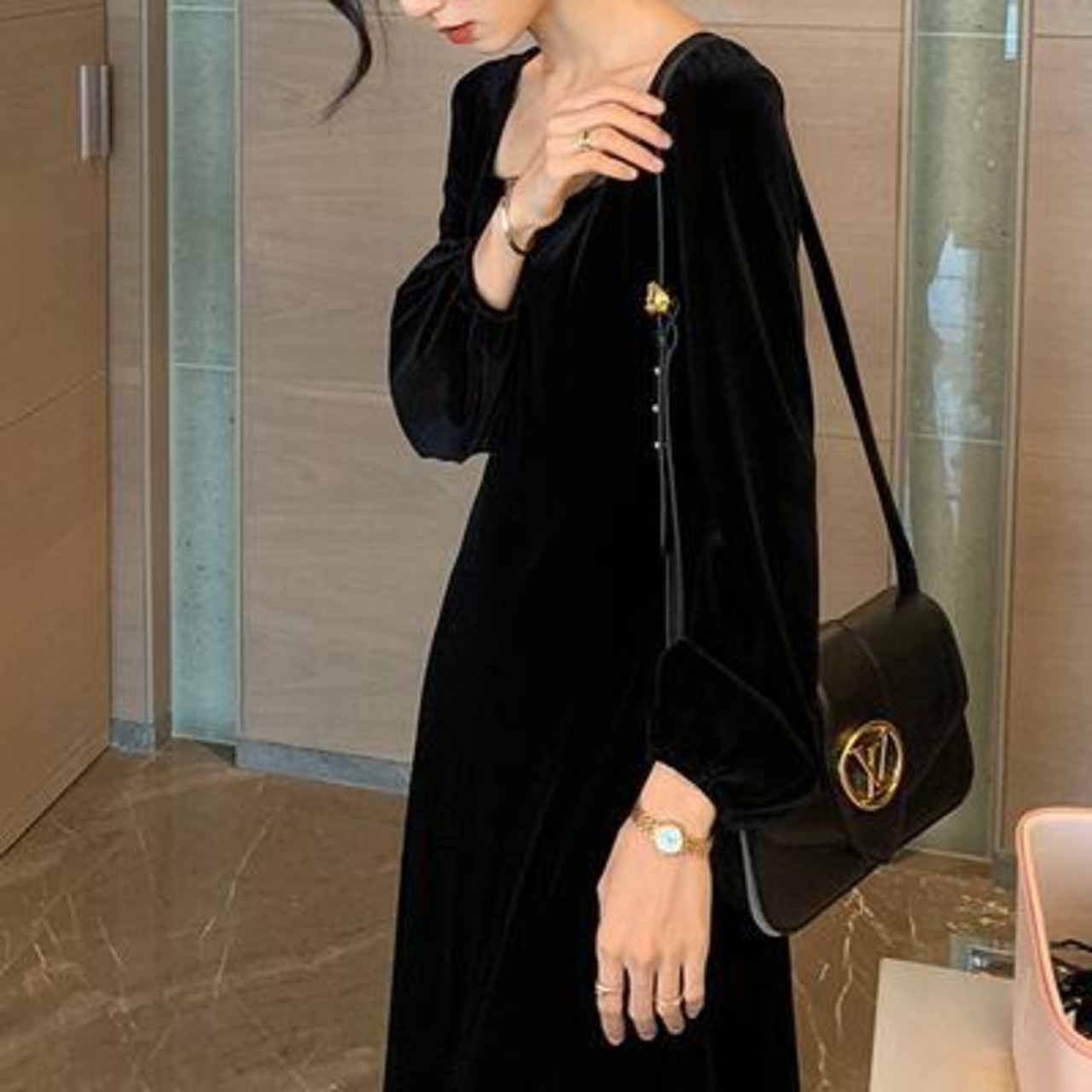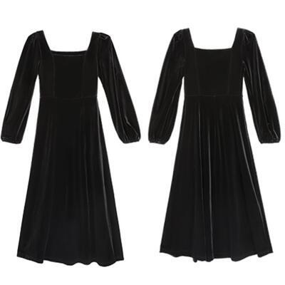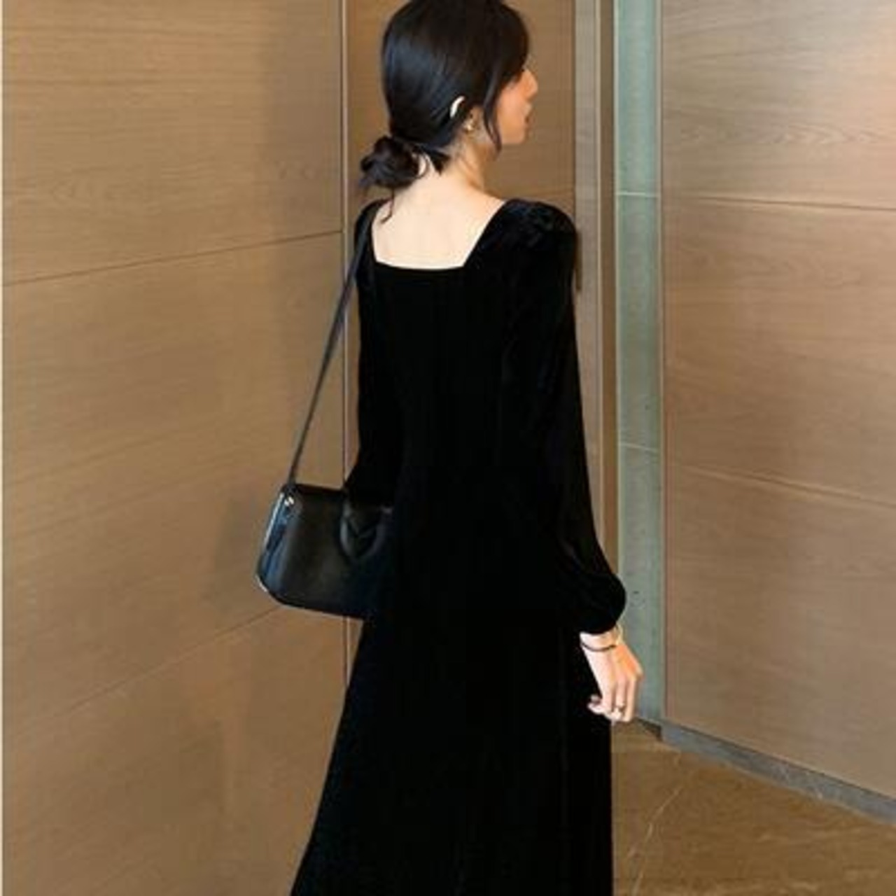 ワンピース レディース ベルベット 袖あり 長袖 パフスリーブ きれいめ スクエアネック ミモレ丈 おしゃれ 可愛い フェミニン カジュアル ワンピ ドレス エレガント シンプル Aライン ハイウエスト ブラック 黒 春 秋 冬 20代 30代 40代 50代