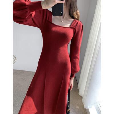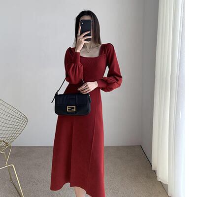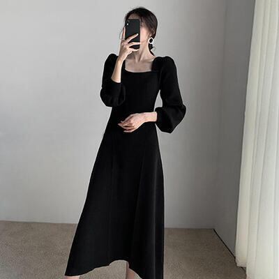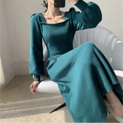 全3色 シンプル ワンピース レディース ニット パフスリーブ 袖あり 長袖 きれいめ スクエアネック ミモレ丈 おしゃれ 可愛い フェミニン カジュアル ワンピ ドレス Aライン ハイウエスト エレガント ブルー レッド ブラック 黒 春 秋 冬 20代 30代 40代 50代