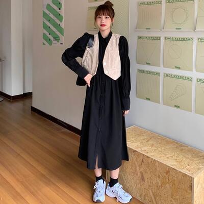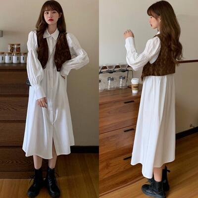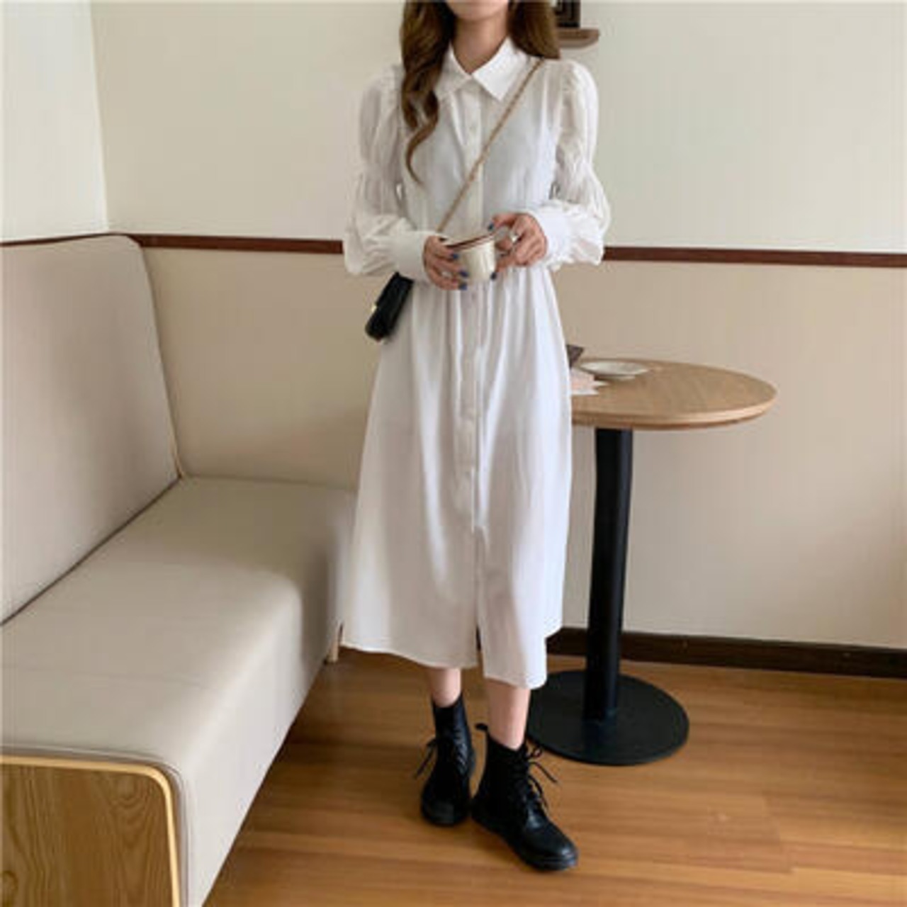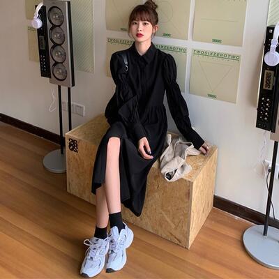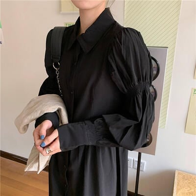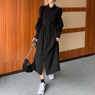 全2色 ワンピース レディース パフスリーブ 袖あり 長袖 きれいめ シャツワンピ ミモレ丈 おしゃれ 可愛い フェミニン カジュアル ワンピ ドレス シンプル Aライン ハイウエスト ブラック 黒 ホワイト 白 春 秋 冬 20代 30代 40代 50代
