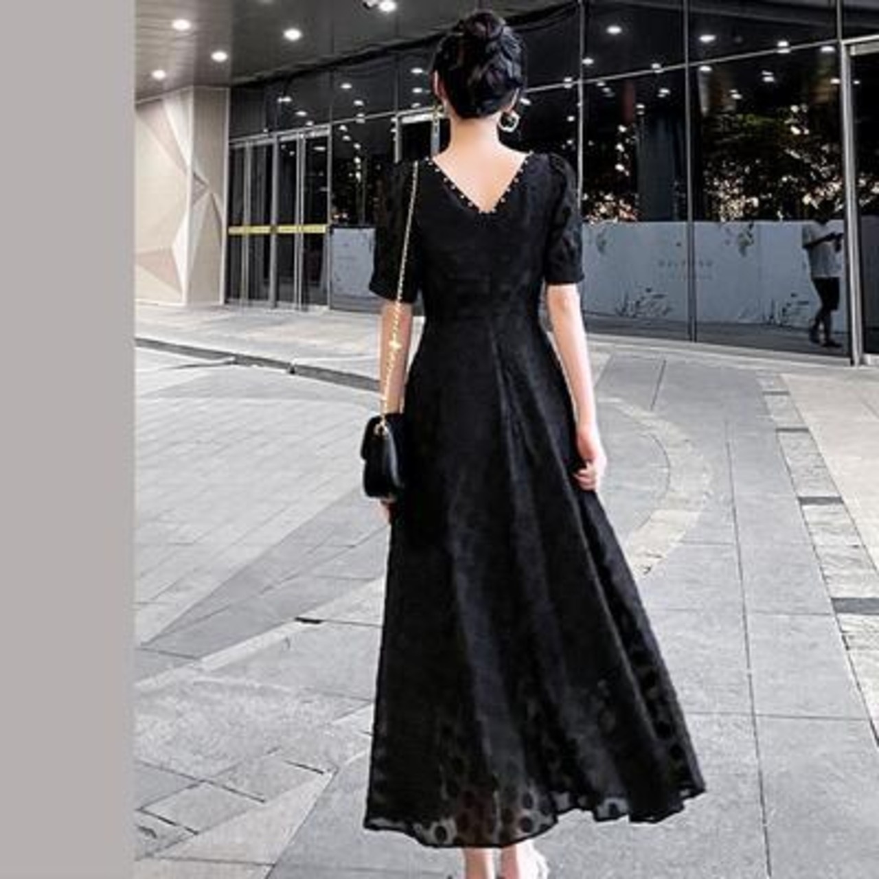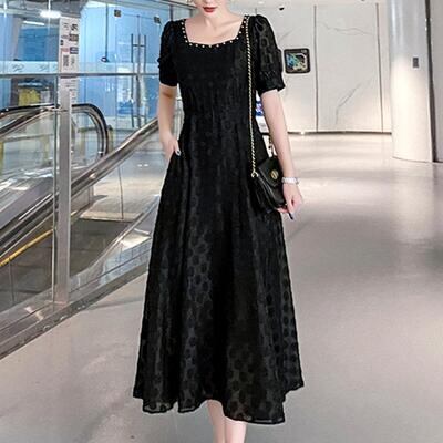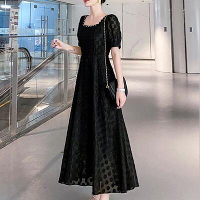 大きいサイズワンピース フォーマル ドット柄 レディース 袖あり 半袖 きれいめ スクエアネック ミモレ丈 おしゃれ 可愛い クラシカル フェミニン エレガント ワンピ ドレス Aライン ハイウエスト パーティー ブラック 黒 春 秋 夏 20代 30代 40代 50代