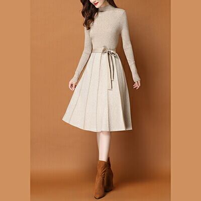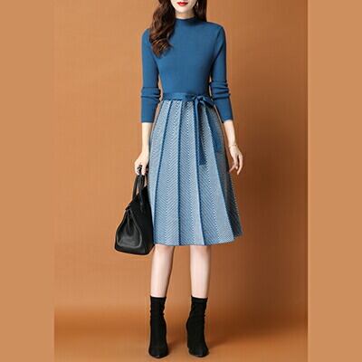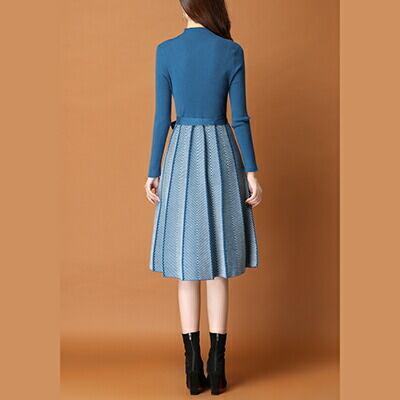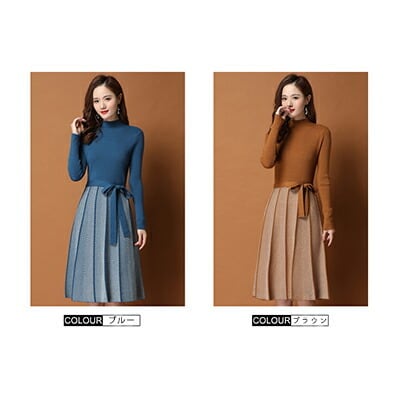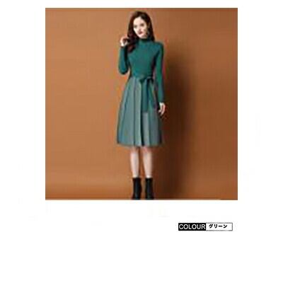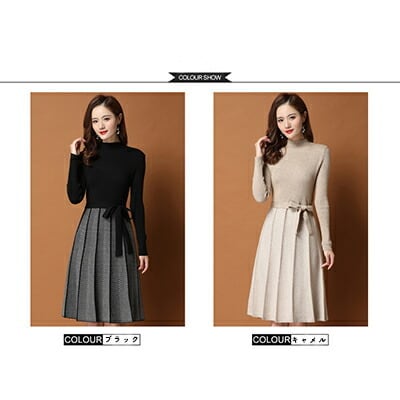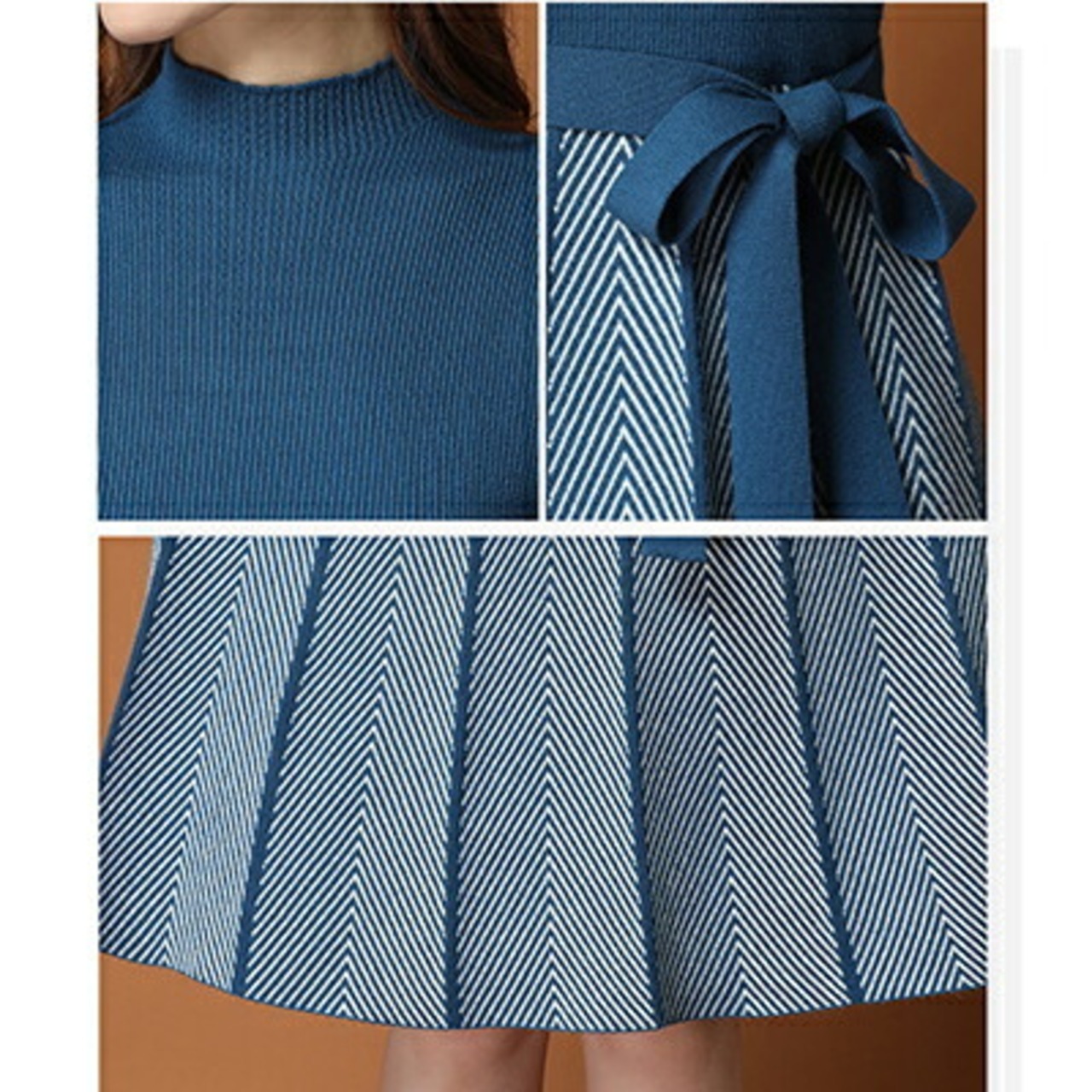 全5色 フェミニン Aライン ストライプ リボン付きロングワンピース レディース おしゃれ ひざ丈 ワンピ ニット ブルー 青 ブラック 黒 キャメル ブラウン グリーン 緑 ドレス エレガント 着痩せ 上品 袖あり 長袖 韓国 コーデ 通勤 お出かけ デート 春 秋 冬 20代 30代 40代 50代
