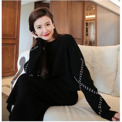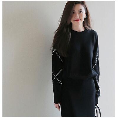 全2色 大きいサイズセットアップ 2点セット スカートセット ニット セーター スカート レディース 長袖 ミモレ丈 カジュアル おしゃれ かわいい フェミニン きれいめ ウエストゴム ステッチ シンプル ナチュラル ブラック 黒 カーキ 春 秋 冬 20代 30代 40代 50代