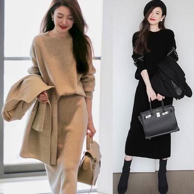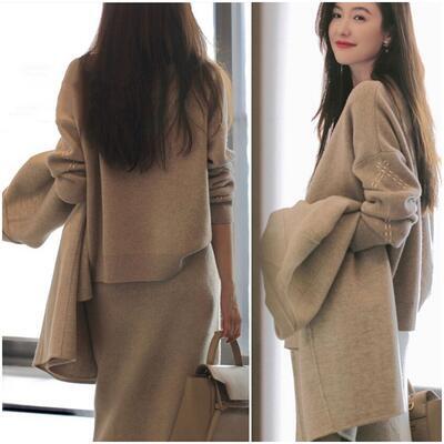ニットのトップスとスカートのセットアップ。