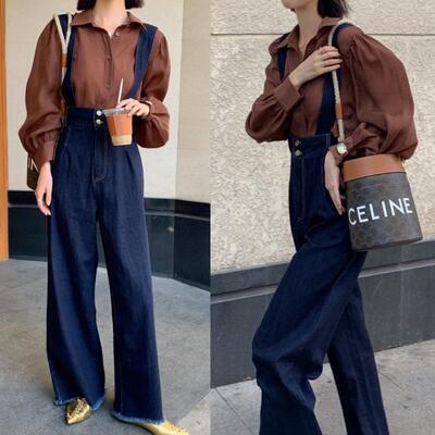 サロペット デニム オールインワン レディース パンツ カジュアル おしゃれ 体型カバー オーバーオール ワイドレッグ ロング丈 シンプル かっこいい 切りっぱなし ハイウエスト ブルー オールシーズン 春 夏 秋 冬 20代 30代 40代 50代
