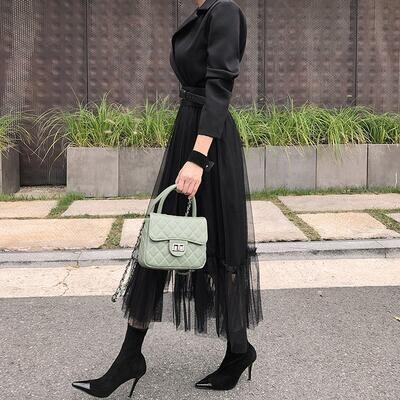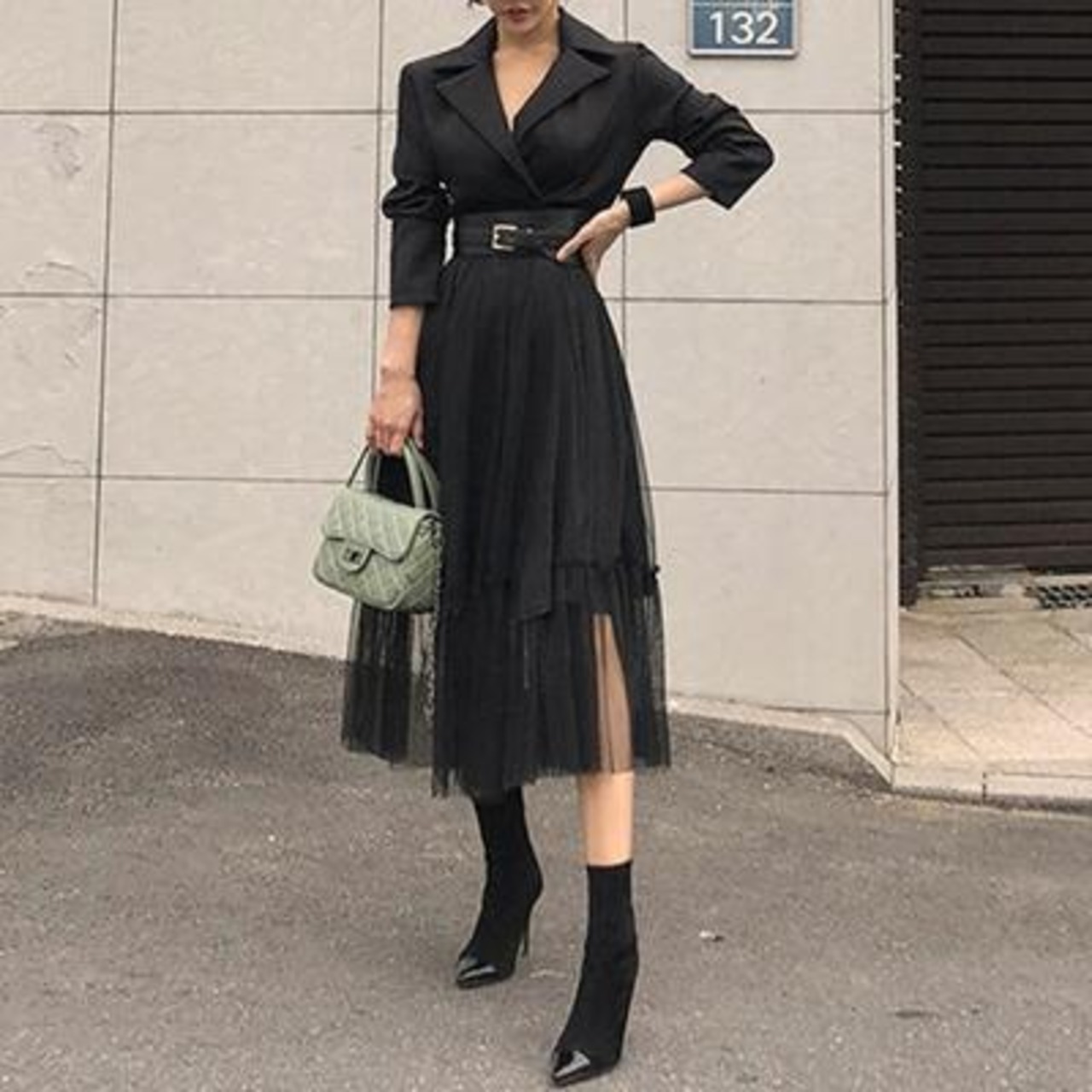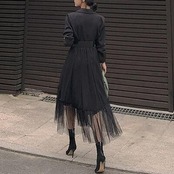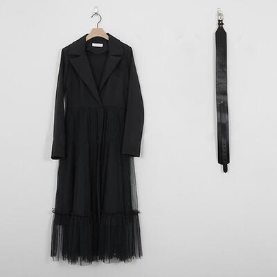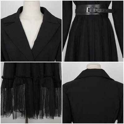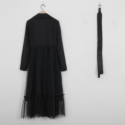 スカート部分にチュールを重ねたテーラードカラーのワンピース。